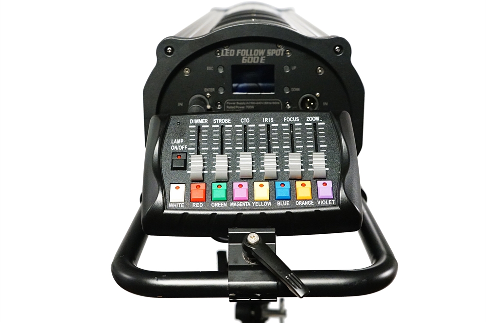 Professional Follow Spot with electronic Zoom and Focus, Led Source 600 watt 7500K, 38000lm, Color wheel 7 colors + open white, CTO wheel? 3200k+4500k+5600k, Beam angle: 7°-13°. 17kg