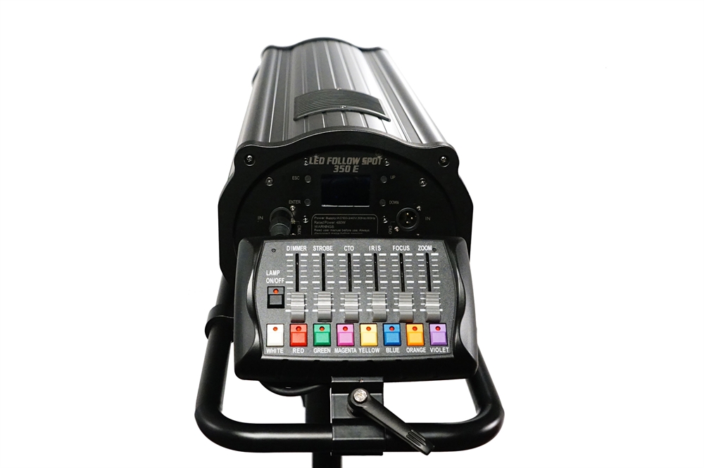 Professional Follow Spot with electronic Zoom and Focus, Led Source 350 watt 8000K, 24000lm, Color wheel 7 colors + open white, CTO wheel? 3200k+4500k+5600k, Beam angle: 7°-13°. 13kg