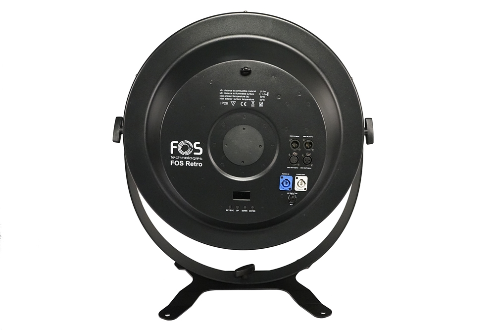 Retro backround fixture, diameter 64cm, 750 watt halogen lamp drived by internal dimmer, 96pcs 3in1 RGB LEDs backround lighting, 4?6?9 DMX channels, Aluminum alloy housing, Lcd menu display,5pin and 3pin XLR, powercon in/out, floor stand,639x330x661 mm 7.5kg.