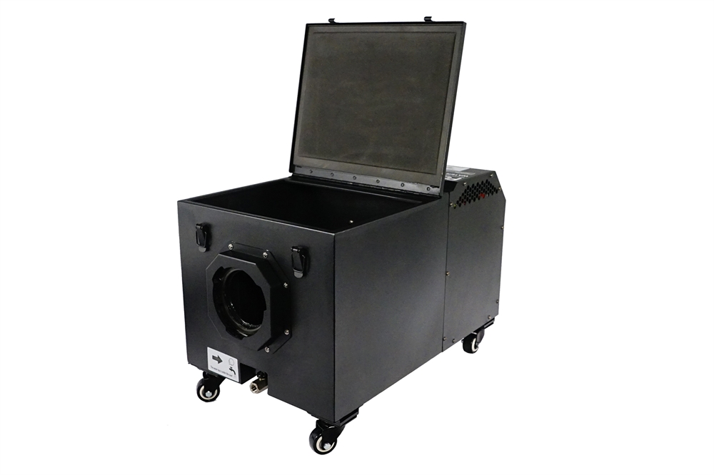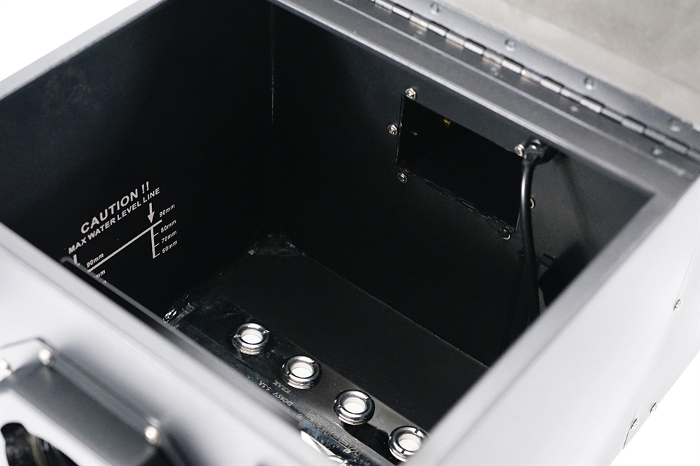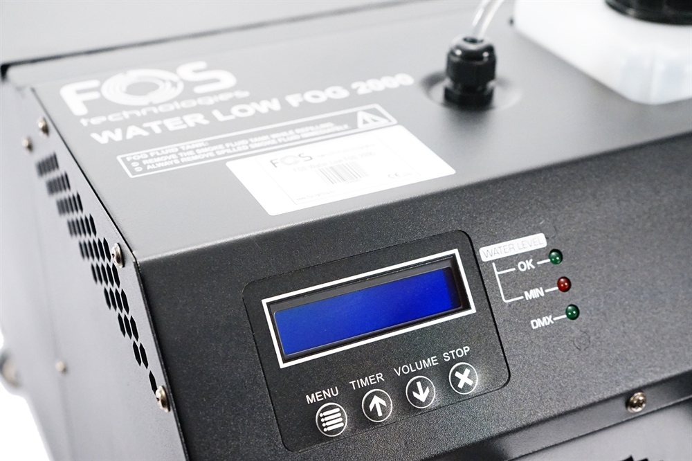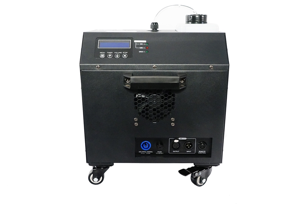 Amazing Low Fog 1200 watt smoke machine that needs only water supply for 100 sqm stage, no need Co2 or Dry ice. DMX 512 , Remote Control LCD screen, 2 dmx channels, heat up time 3.05 mins, fluid consumption 1-40ml/min, fluid-less protection, self cleaning function.