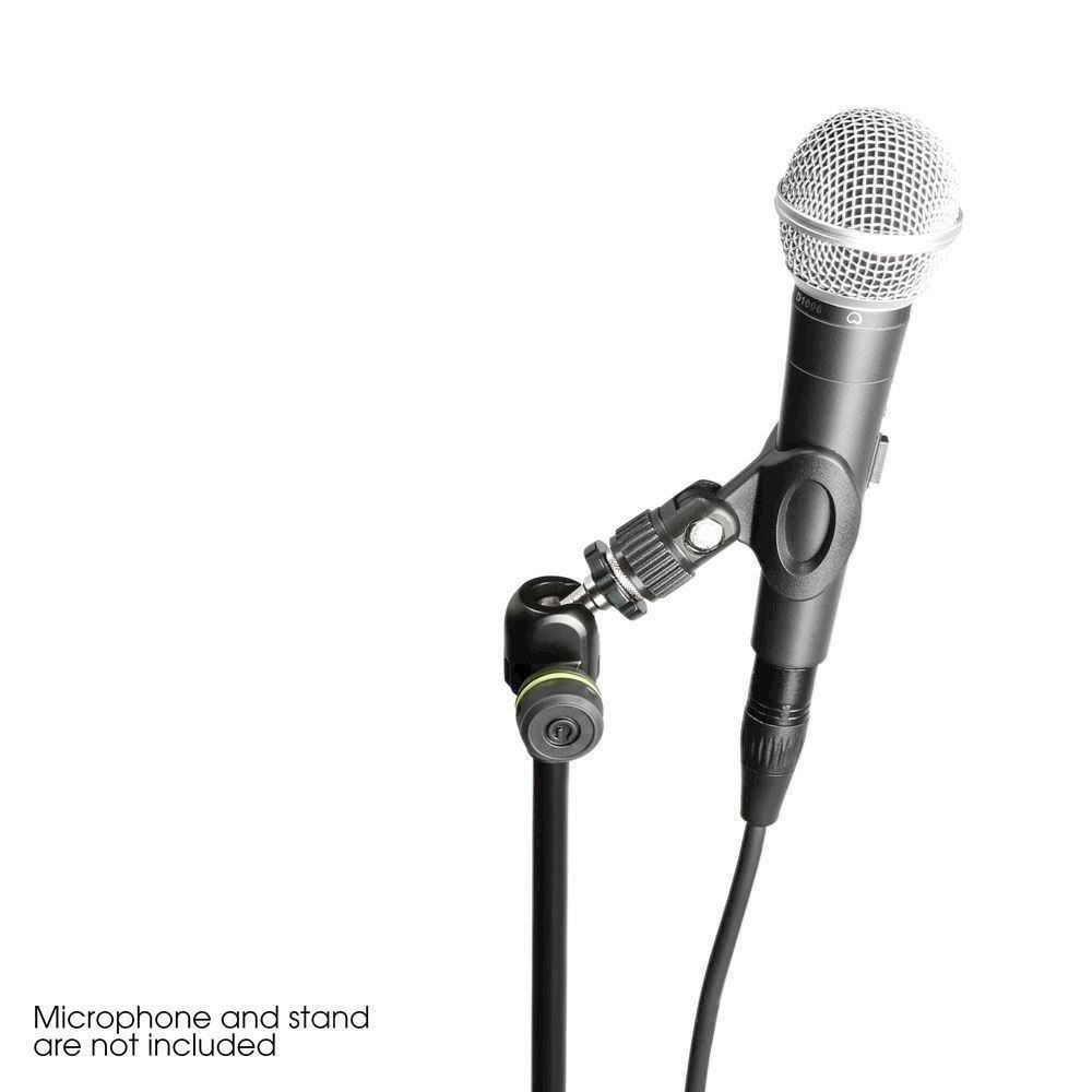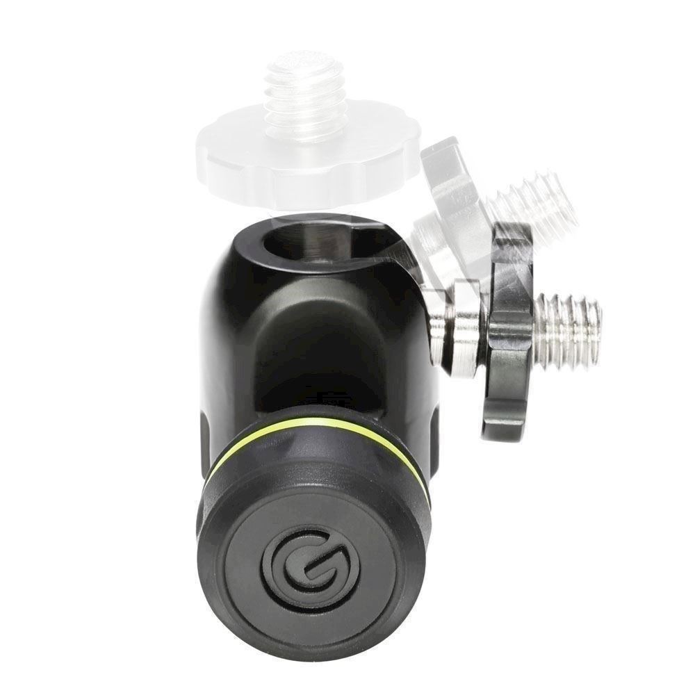 The Gravity Quick Tilt mic adapter features a ball joint and guide slot for 90° maximum tilt. The mic stand end has a 3/8" female thread and oversized set screw that facilitate 360° rotation and locking the adapter in place, the 3/8" mic end sports an aluminium retainer ring. The all-metal GMSQT 1 B is ideal for rock-solid, precision positioning of microphones, portable digital audio recorders or cameras. It includes a 3/8" to ¼" adapter and works with any standard mic clip, shock mount or stereo bar.