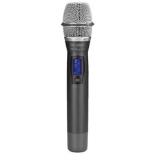 | Her ses vores trådløse mikrofoner, der i forbindelse med en beltpack kan fungere som en håndholdt mikrofon, der har en trådløs funktion. Denne trådløse mikrofon kan bruges i forskellige situationer, men er især smart at anvende, hvis man fx skal holde foredrag eller optræde foran en større forsamling af mennesker, hvor man ikke ønsker at have en synlig ledning. |