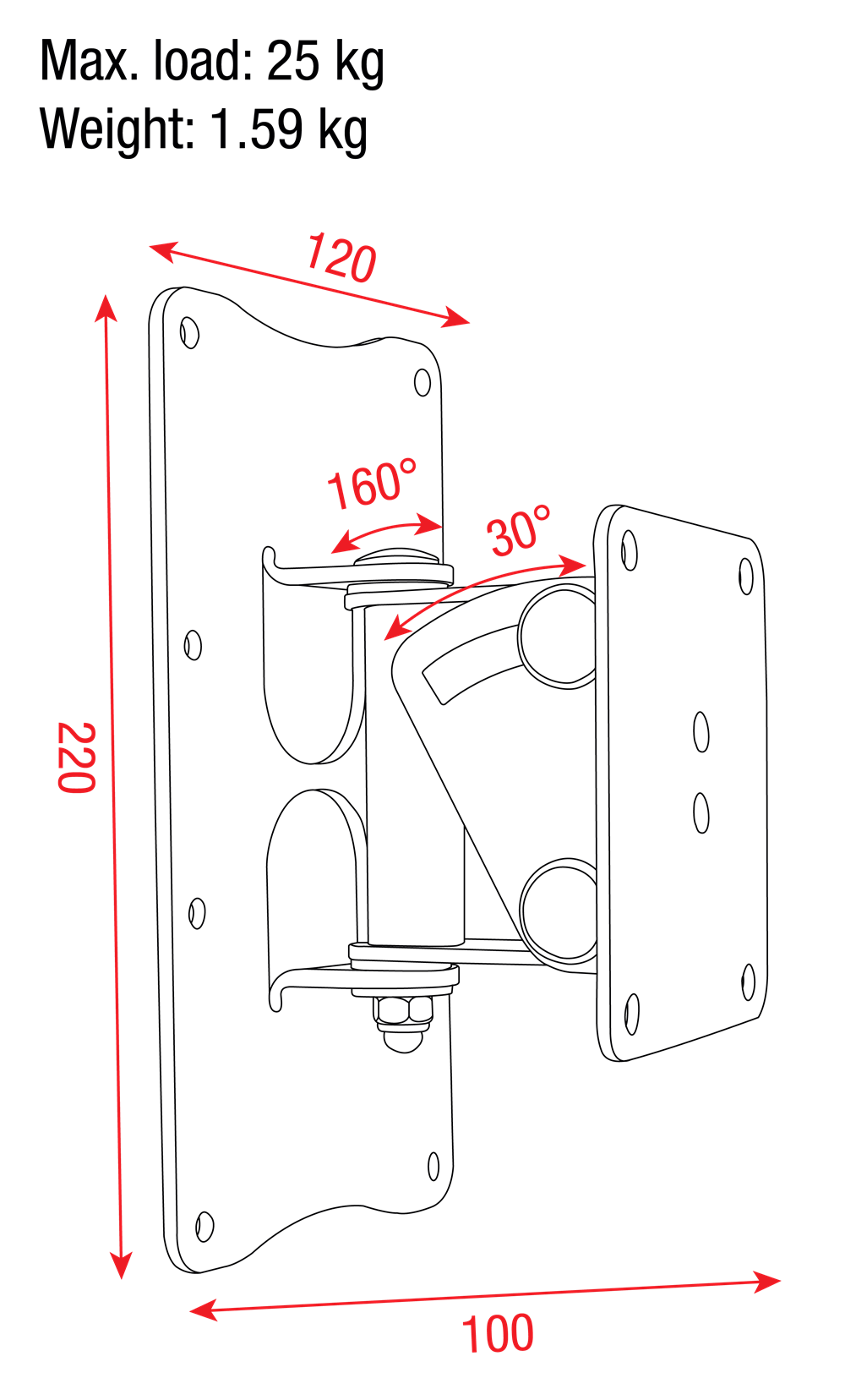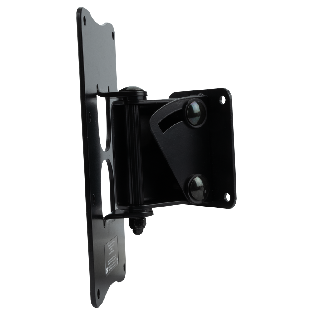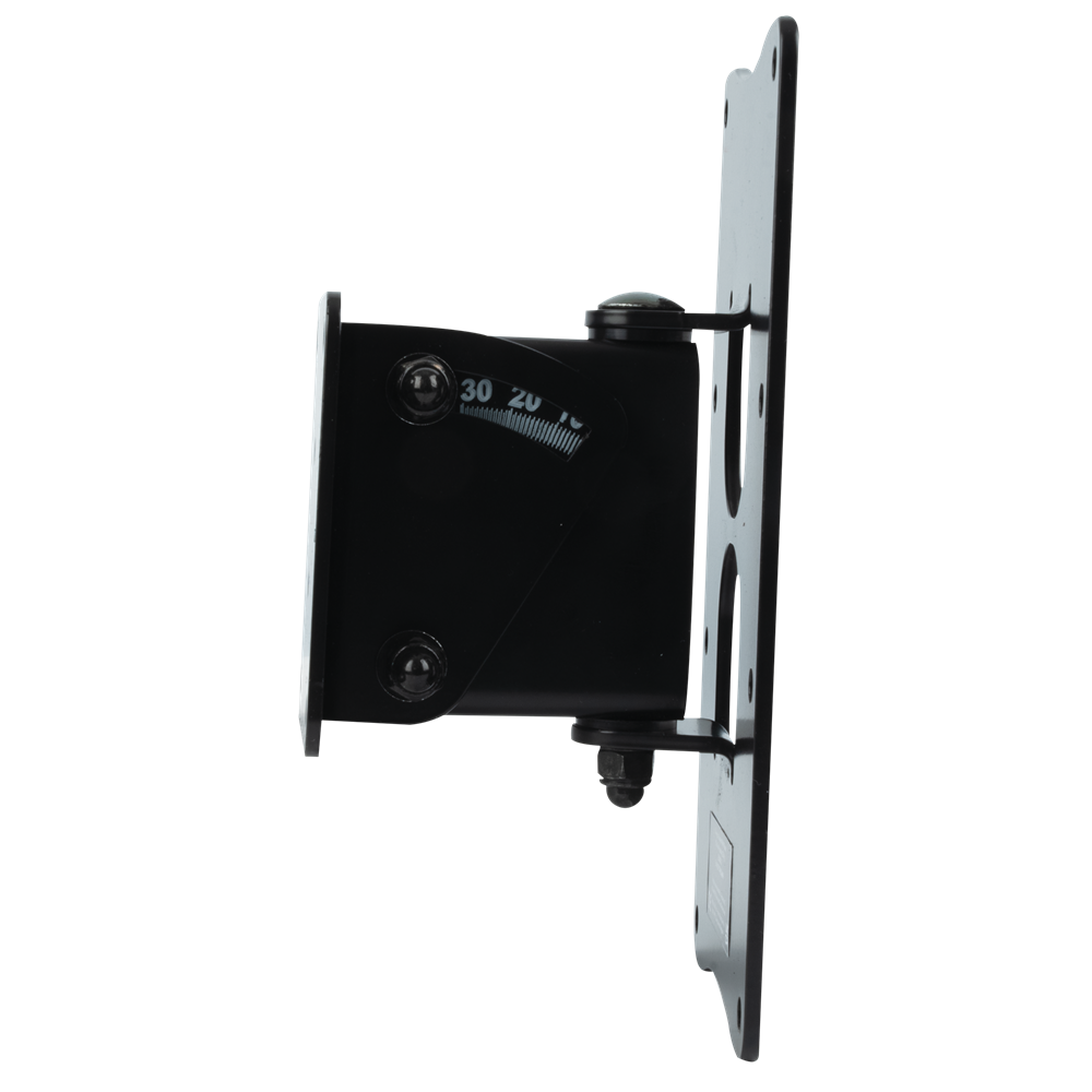 Højttalervægbeslaget er lavet af pulverlakeret stål og giver mulighed for både vandret og lodret justering for præcis retningsindstilling. Den kontinuerlige side-til-side drejevinkel er 160°. Den nedadgående hældning er trinløs og kan justeres op til maksimalt 30°. Højttalervægbeslaget er fremstillet af kraftigt 4,5 mm stål og kan bære højttalere på op til 25 kg