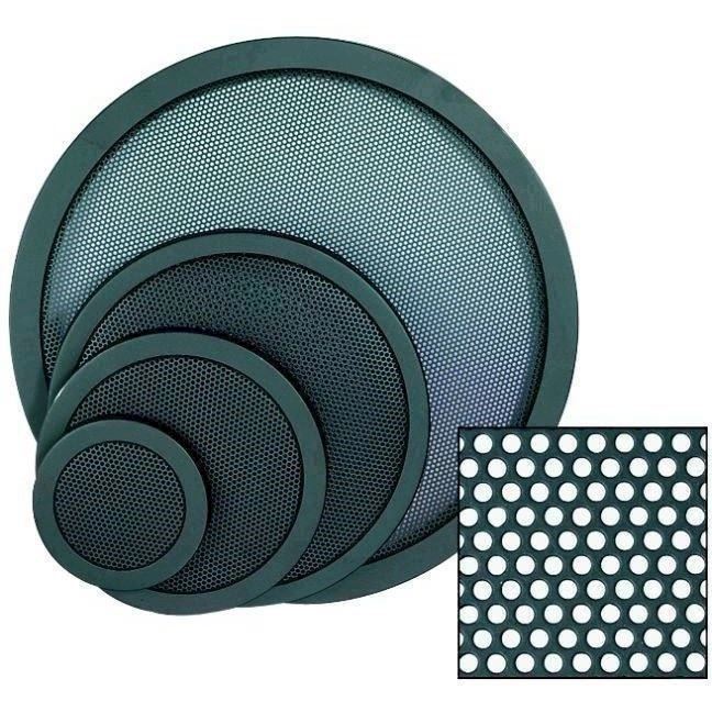 Decorative speaker grilles, two parts, for the most common standard speaker sizes. Mounting rim serves for mounting the speaker; cover rim with metal grille covers speaker and mounting completely.