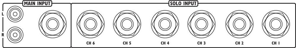 | Inputs | 2 x RCA L/R (main), 2 x 6.3 mm jack (main), 6 x 6.3 mm jack (solo) |