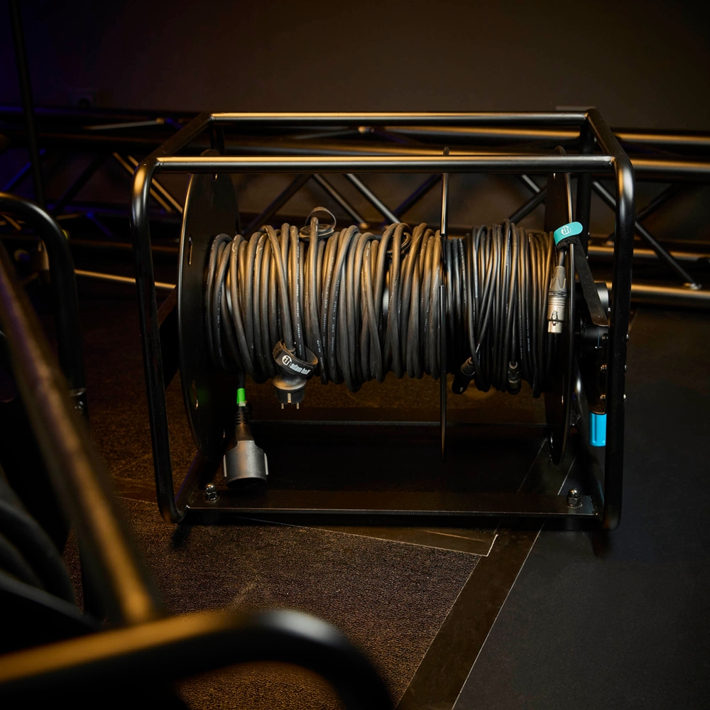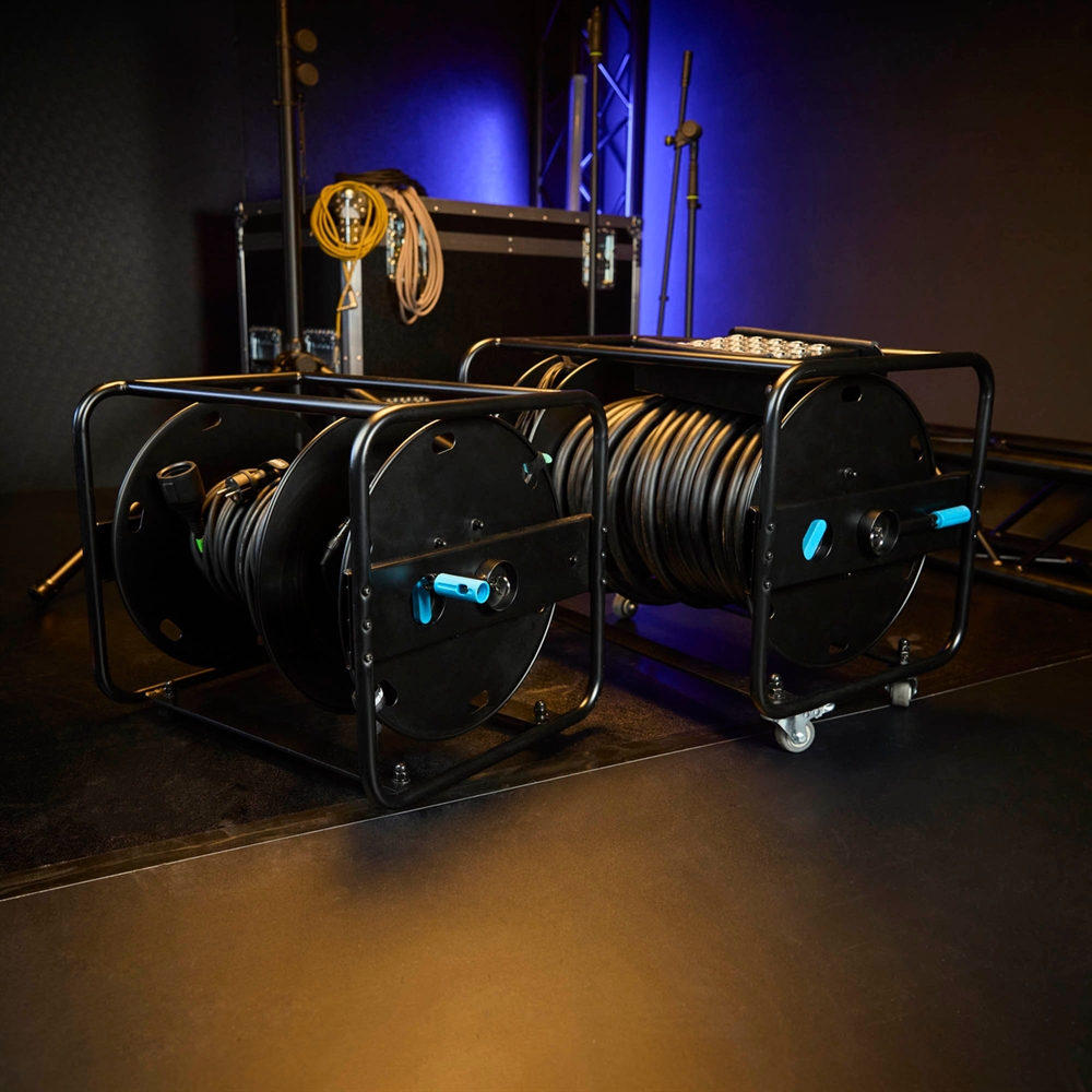 An adjustable, bolted separator can be placed in three different positions, allowing the size of the two winding regions to be adapted to the respective requirements. The separator allows the plug or stage box to be disconnected from the cable or an additional cable to be placed on the drum.