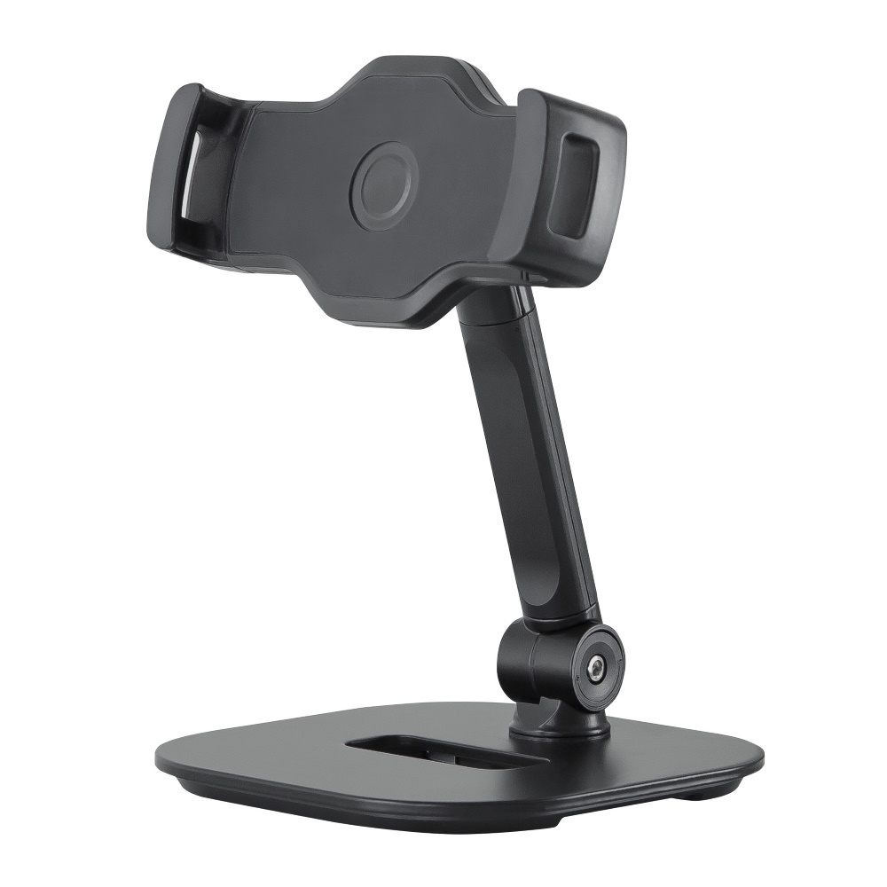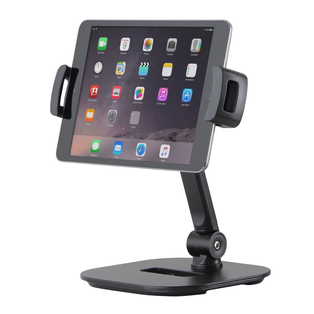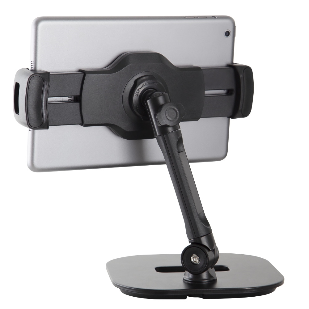 Lækkert og stabilt bordstativ til tablets eller smartphones. Holderens "clamp" kan justeres fra 130 til 224 mm. og den kan drejes, så man selv vælger, om ens device monteres på den korte eller lange led. Dermed passer den både til de fleste smartphones og tablets op til 13".