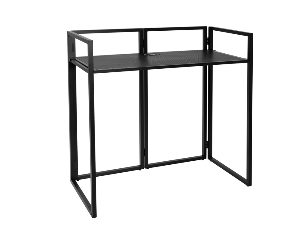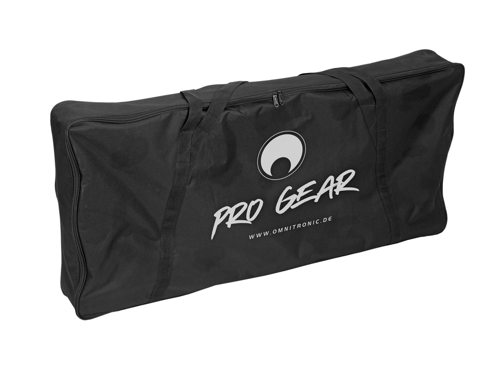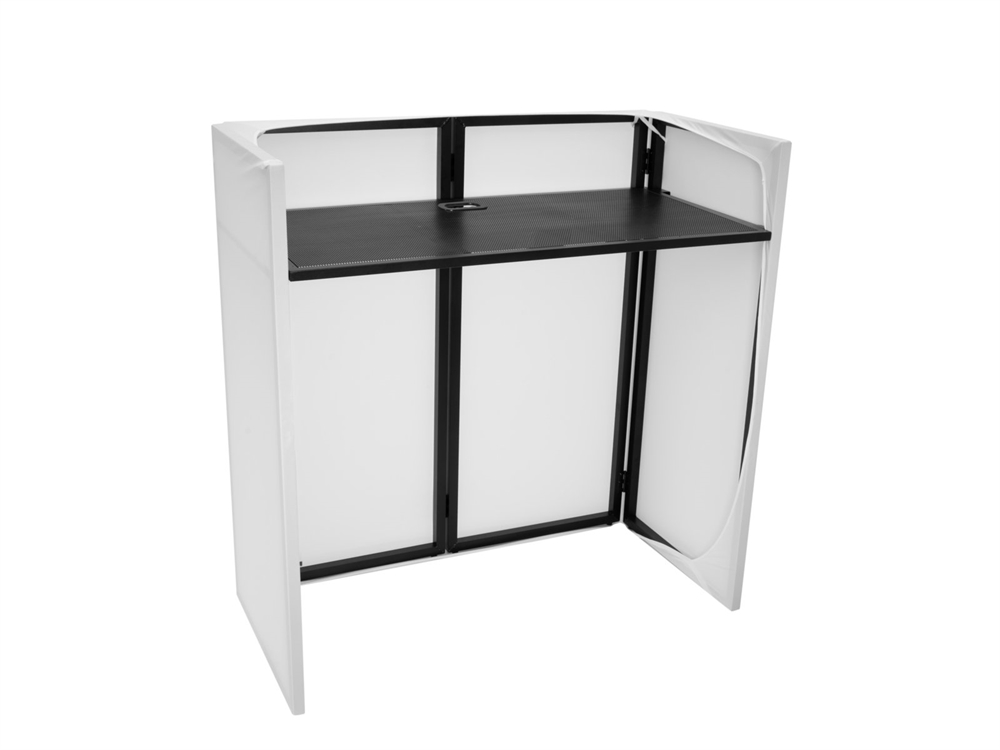 This ultra-compact Omnitronic stand creates a professional look for your DJ gigs. Made of a lightweight and foldable aluminum frame, the DJ stand offers you a workspace of 105 x 52 cm. The working height is 95 cm. The setup is done in no time at all and without any tools. The lycra covering meets B1 and can be backlit with various lighting effects to further support the performance. A practical transport bag is included in the delivery. Interchangeable covers and add-on corner shelfs are available as accessories.