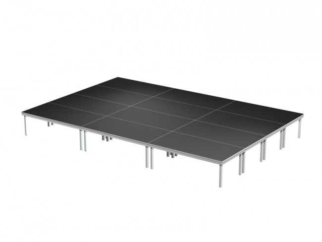 Denne Standard Scene på 24 m2 er et af de mest populære scene setup i Danmark. Med sine firkantede ben er det utrolig robust og stabilt, hvilket gør det velegnet til både indendørs og udendørs brug. Der findes også tilbehør som trappe og gelænder til podiet. Den vandskyende overflade gør, at det kan tåle det danske vejr.
