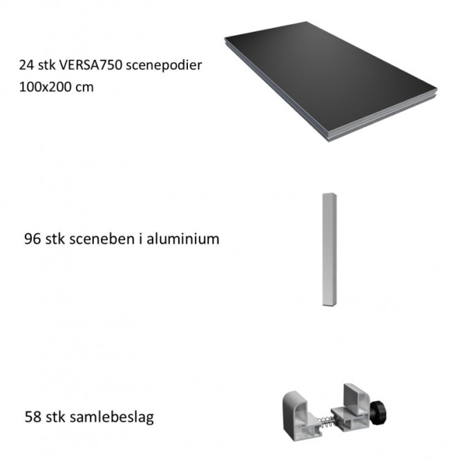Denne Standard Scene på 48 m2 er et af de mest populære scene setup i Danmark. Med sine firkantede ben er det utrolig robust og stabilt, hvilket gør det velegnet til både indendørs og udendørs brug. Der findes også tilbehør som trappe og gelænder til podiet. Den vandskyende overflade gør, at det kan tåle det danske vejr.