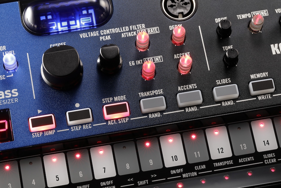 The sequencer of the volca nubass provides three functions that add the slap and slide performance techniques that are distinctive of acid bass: these transpose, accent, and slide functions are accessible and controllable through the step sequencer.
