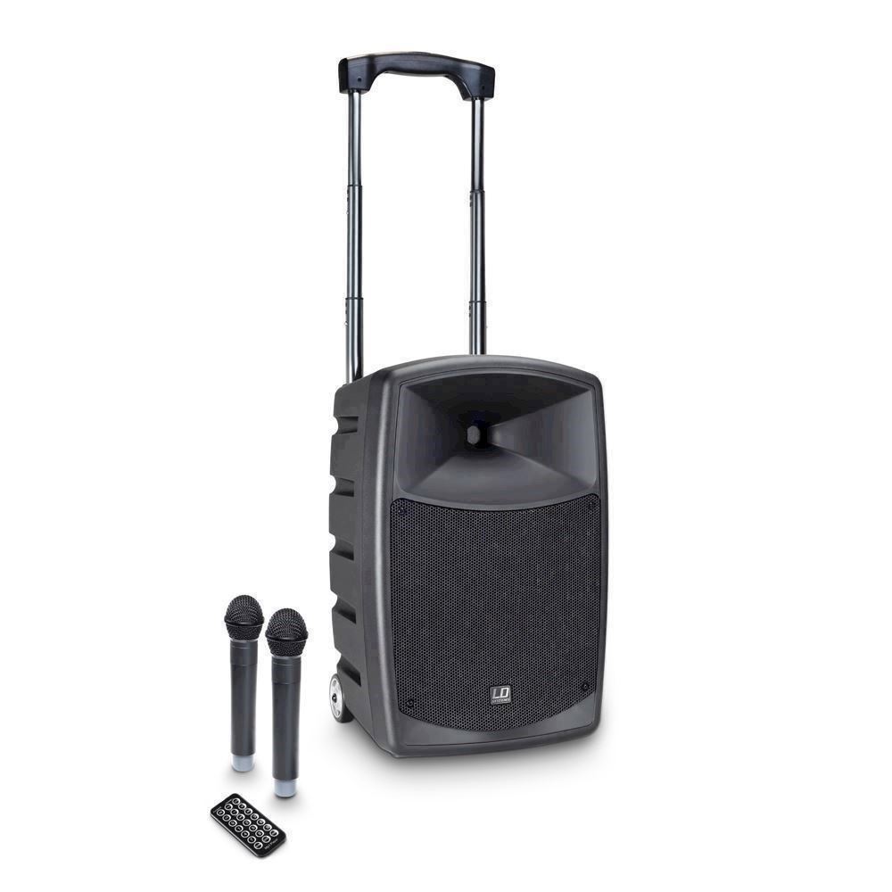 The Roadbuddy relies fully on wireless transmission: it has an UHF radio receiver which operates with 655 - 679 MHz range. The on-board Bluetooth player with backlit multifunction display ,equalizer, USB port and SD card slot supports the mp3, wma and wav formats. Two handheld microphone with 10 mW output power(LDRBUD10HHD2B6), two headset microphones with belt pack (LDRBUD10BPH2B6) or as an alternative a handheld microphone and a headset microphone with belt pack (LDRBUD10HBH2B6) and an IR-remote control for the player are included.