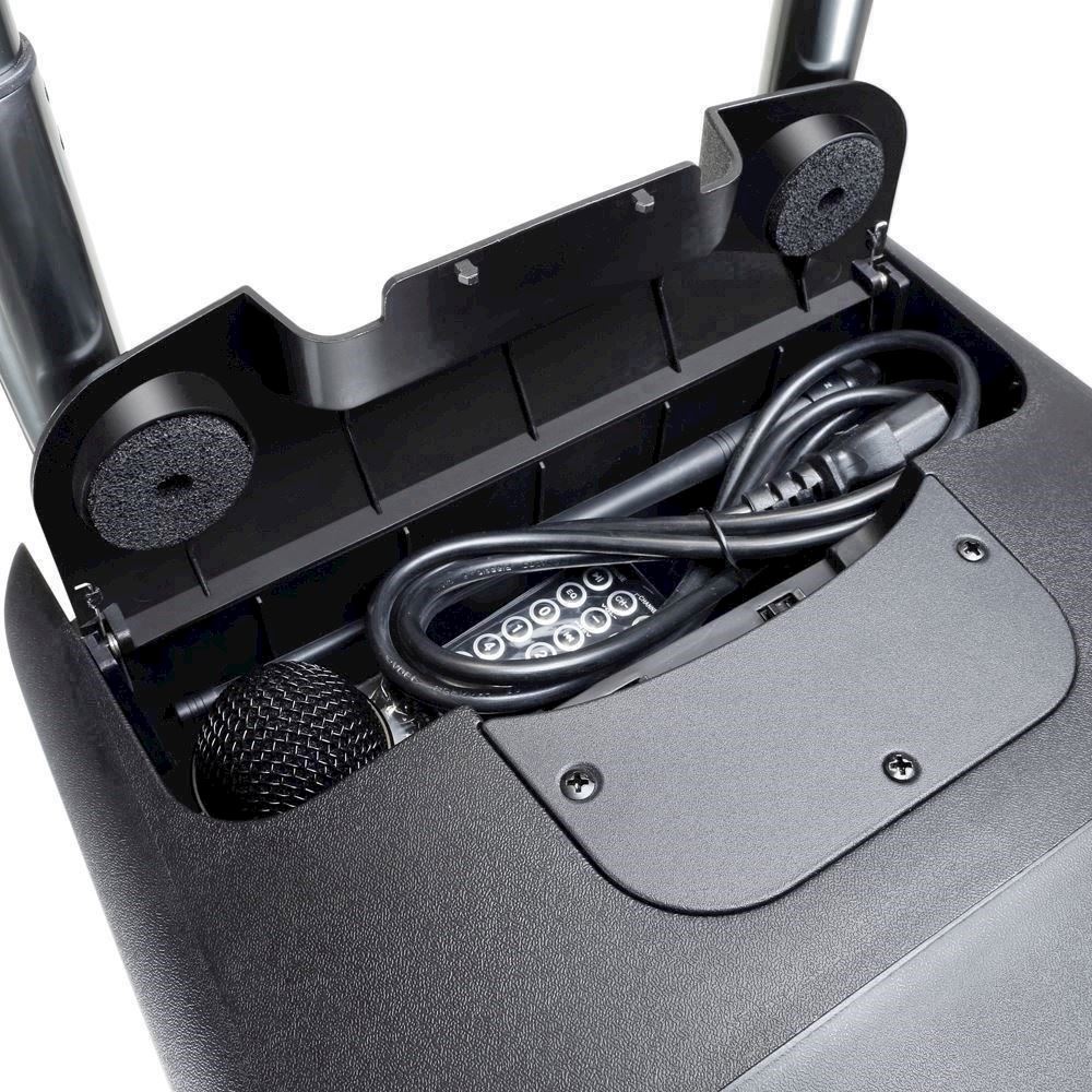 The LD Systems Roadbuddy is easily transportable thanks to built-in castor wheels and a pull-out handle. On the top, there is a handy storage compartment for up to two hand-held transmitter microphones. The plastic housing of this lightweight device has been designed to accommodate a 35 mm tripod mount.