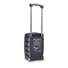 The LD Systems Roadbuddy is easily transportable thanks to built-in castor wheels and a pull-out handle. On the top, there is a handy storage compartment for up to two hand-held transmitter microphones. The plastic housing of this lightweight device has been designed to accommodate a 35 mm tripod mount.