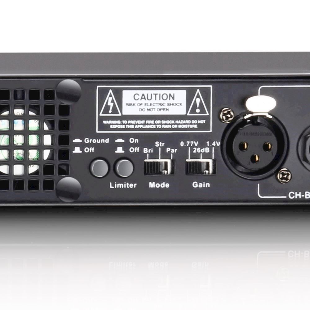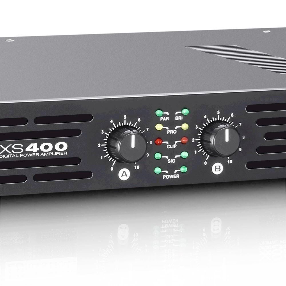 The XS400 has all protection circuits against short-circuiting, DC, overheating, and overloading and has a soft-start delay. The amplifier features XLR, RCA and jack input connectors, with Speakon-compatible sockets and screw terminals as outputs. On the rear panel, it is possible to select the mode of operation and gain and activate the limiter and ground-lift function. LEDs on the front indicate power, signal, clipping, triggering of the protection circuit, and the mode of operation. The transparent sound of the XS400 stands out with high dynamics and impulse fidelity.