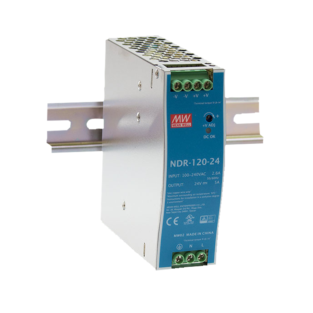 NDR-120-24 er en slank-design DIN-skinnestrømforsyning, der kan monteres på TS-35/7.5 eller TS-35/15 DIN-skinner. Den er beregnet til industrielt brug og er bygget i overensstemmelse med UL 508-standarden. Den har en indbygget konstantstrømsbegrænsende kreds, der tilbyder robust kortslutningsbeskyttelse. Kølingen styres af fri luftkonvektion, der understøttes af dets metalhus. Den accepterer indgangsspændinger fra 90-264 V AC og er fuldt beskyttet mod overbelastning, overspænding og overtemperatur.