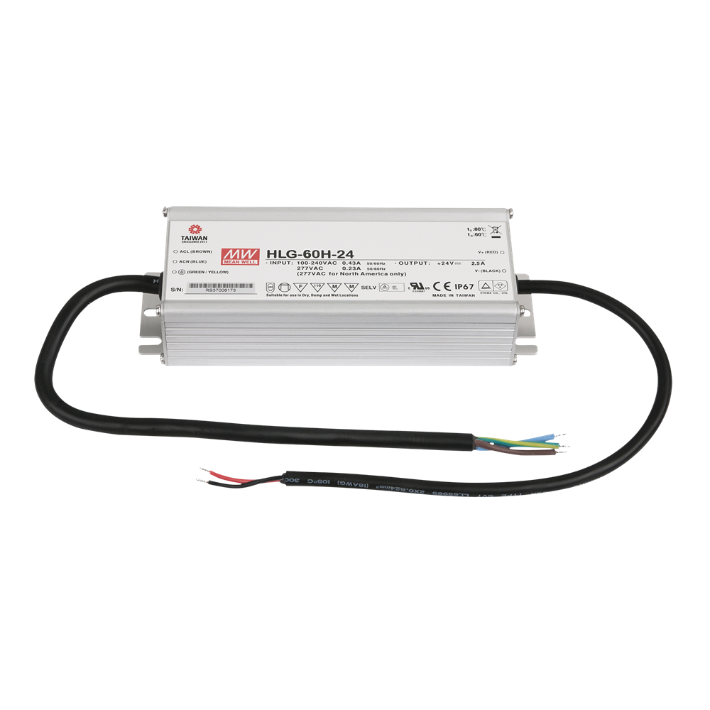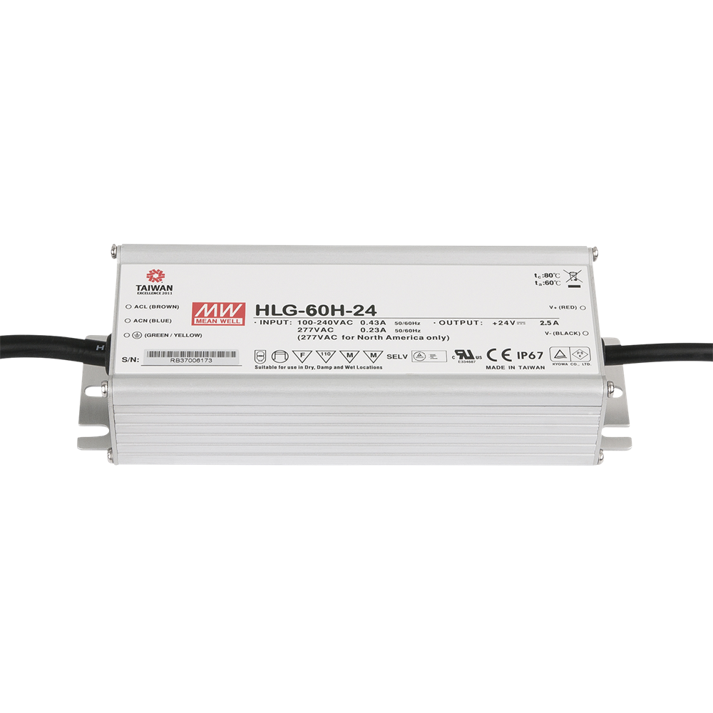 Denne LED strømforsyning på 60 Watt / 24 V DC IP67 fra Meanwell (HLG-60H-24) er ideel til at levere pålidelig strøm til dit LED-belysningssystem. Med en indgangsspænding på 90-305 Volt AC og en udgangsspænding på 24 VDC, opnår du effektiv og stabil strømforsyning. Denne strømforsyning er IP67-klassificeret, hvilket betyder, at den er beskyttet mod støv og vandindtrængning. Perfekt til udendørs brug.