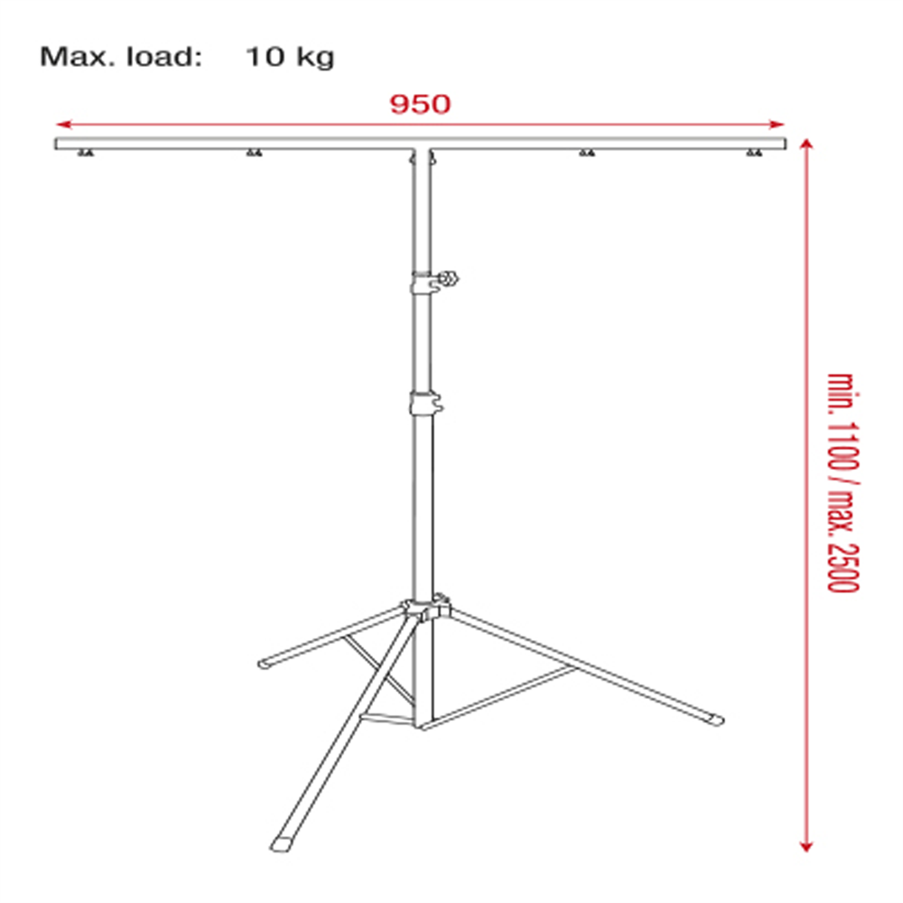 Showgear Light Stand Lite inkluderer en 95 cm T-Bar og kan bære en samlet belastning på 10 kg. Stativet kan forlænges op til 250 cm ved brug af de 2-delte teleskopiske rør.