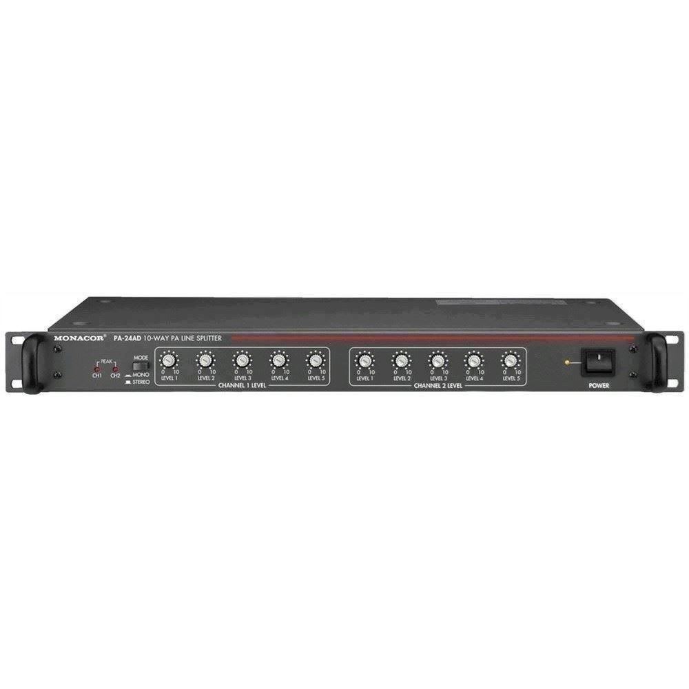 Her er du: Disconetto » LYD » Installationslyd » Signalprocessorer » Signal tilpasning Line-splitter - PA-24AD - MONACOR På lager På lager, 2-4 dage Bedømmelse for Line-splitter - PA-24AD - MONACORProduktet er endnu ikke bedømt 2.399,00DKK ved 1 stk. Vis uden moms Trustpilot 10-way PA line splitter2 separate inputsStereo operation or mono operationBalanced XLR connection for each input and outputGain control for each outputPeak indication for each inputMains operation and 24 V emergency power operation TypesplitterFrequency range20-20,000 HzControl range-Control frequencies-Input signal0.775 VInput sensitivity-Input impedance15 kΩOutput signal0.775 VOutput impedance600 ΩGain-Compression-Gate ratio-Crossover frequency-High-pass filter-Low cut-Transmission ratio-S/N ratio> 68 dBChannel separation-THD< 0.05%Admiss. ambient temp.0-40 °CPower supply∼ 230 V/50 Hz/10 VADC current 24 V/0.2 ADimensions482 x 45 x 235 mm, 1 RSWeight2.9 kgInputs2 x XLROutputs10 x XLROther features- Varenr.: 171890 Vi anbefaler Nødstrømforsyning - PA-24ESP - MONACOR DKK 4.309,00