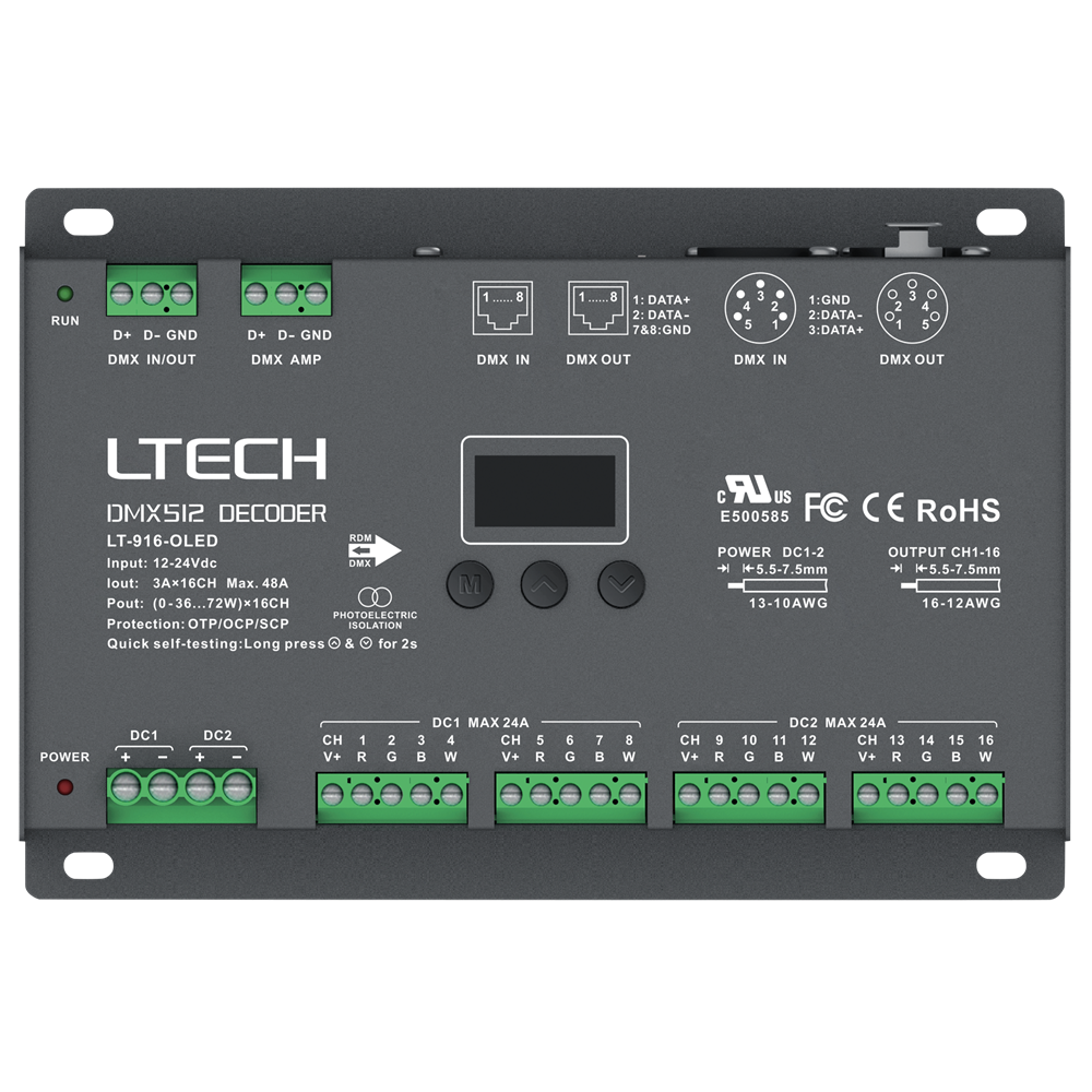 Denne 16-kanals, 3A DMX LED-driver er designet til højtydende, multikanals applikationer. Den er udstyret med 5-pin XLR, RJ45 og terminal DMX porte. Dens OLED display viser informationer, herunder DMX adressen, PWM-frekvensen, mode (Dæmp, CT, RGB, RGBW), grå niveau og dæmpningskurven. De indbyggede kontrolknapper kan bruges til let at justere parametre. Med RDM-protokollen også ombord, kan operationer udføres via RDM-masterkonsollen.