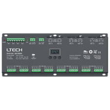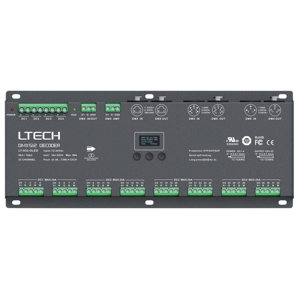 Denne 32-kanals, 3A DMX LED-driver er designet til højtydende, multi-kanals applikationer. Den er udstyret med 3-pin og 5-pin XLR, RJ45 og terminal DMX-porte. Dens OLED-display viser information inklusiv DMX-adressen, PWM-frekvensen, modus (Dim, CT, RGB, RGBW), opløsningen og dæmpningskurven. De indbyggede kontrolknapper kan bruges til let at justere parametrene. Med RDM-protokollen ombord kan operationer også afsluttes via RDM master-konsollen.