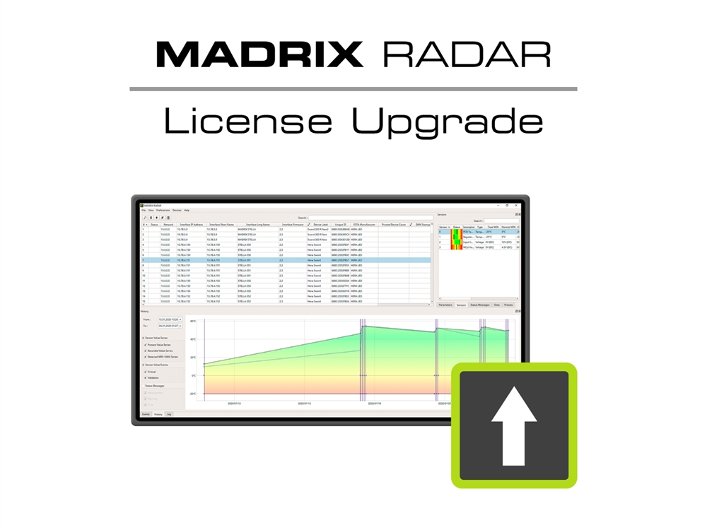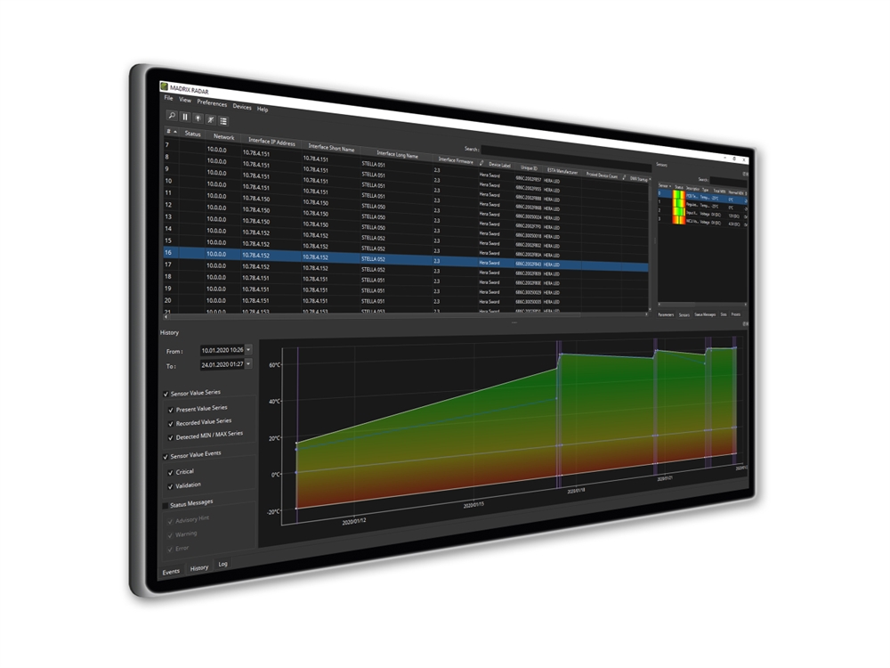 MADRIX RADARFully automatic 24/7 device monitoring.Automatic e-mail notifications.Unleash the full potential of RDM.ManagementManage all of your devices the remote way. Manage them the smart way.Everywhere, lighting designs beautifully light up the world all around us. And clients expect them to do so without failure, each and every day. Behind the scenes, the lighting industry faces the complex aspects of modern technologies. Increasingly large projects become increasingly difficult to manage and maintain.That is why today´s DMX lighting fixtures are equipped with Remote Device Management. It is a two-way communication for receiving instructions as well as sending out feedback. When devices report back data, you gain access to a whole new level of available information, insights, and control. MADRIX RADAR is the complete toolbox to make the most of this data; automatically and efficiently.Supervise all of your lighting fixtures in a single software. Handle large amounts of RDM devices. It is a new kind of application that opens up entirely new possibilities for you and your clients. MADRIX RADAR includes automatic fixture patching, fully automatic 24/7 device monitoring, automatic e-mail notifications, and much more.Transform how you work with luminaires. Easily configure settings remotely. Let the software monitor devices automatically for you. Quickly see the results in graphical overviews at a single glance. That means that your setup and maintenance processes are much faster, much easier, and much more cost-efficient than ever before.Build a database of past sensor data and see the progression of device parameters, such as temperature and operating hours. Exchange devices that are likely to fail soon, before they do. Make your maintenance costs much more predictable by planning them more effectively in advance.Provide unparalleled support for each installation.Start offering all-new benefits to your clients.Unleash the full potential of RDM.ConfigurationMeet your favorite new addressing tool.Convenient Remote AccessEasily set up your RDM devices remotely. This means you can perform any configuration conveniently from your computer; instead of requiring direct access to the devices themselves in the truss, in the ceiling, or on the facade.Simplified Fixture AddressingAvoid the complicated procedure to manually set up all of a project´s lighting fixtures by hand before they can be mounted. Freely modify their settings, such as the important DMX start address, after any installation has taken place.Incredibly Fast WorkflowsDrastically reduce the time-consuming process of configuring a large number of devices. Use the built-in search function and change settings of a single device or select several entries to quickly make multiple changes at once.Incredibly Powerful AutomationLet the software automatically patch all fixtures in a single DMX universe or across the entire range of addresses. Simply use drag and drop to put them in the correct order. Setting up DMX addresses has never been faster.Useful Fixture DiscoveryUse the built-in highlight mode to let a fixture flash with full-on white for quick identification of fixtures in your installation. See if a device correctly responds to DMX commands or if the lighting fixtures are addressed correctly in a row.Full SupportMADRIX RADAR supports all RDM parameters detailed in the official protocol specifications of ANSI E1.20 and ANSI E1.37-1 over Art-Net (including the ArtRdm package). All fixed parameters (PIDs for Set and Get) and manufacturer-specific parameters are included.MonitoringFully automatic 24/7 device monitoring with automatic notifications.Continuous MonitoringLet the software monitor all of your devices 365 days a year, 7 days a week, 24 hours a day. It does so fully automatically without any required supervision. This simply wasn´t possible before.Making Sensor Data UnderstandableMADRIX RADAR checks the status of devices, such as voltage, temperature, status, power cycle, life cycle, and more. Graphical overviews allow you to quickly see if a sensor value is within its specified limits or out of its valid range.Event ReportsIn addition to merely requesting and receiving information, the software will apply its own logical routines in order to create events for you. By probing and validating incoming data, MADRIX RADAR provides actionable reports for you.Automatic NotificationsIf MADRIX RADAR detects any irregularities, you can receive automatic status updates within the software, run a PowerShell script, or let the system conveniently send you e-mails. In short, you are always up to date.The MADRIX SystemTake advantage of high-quality software and high-quality hardware.MADRIX RADAR is an independent software that allows you to choose compatible RDM nodes.You gain the enormous advantage with MADRIX RDM nodes of running a fully integrated system. Our MADRIX hardware processes RDM data packages in a way that does not result in interference with DMX data packages during full and live operation, which could lead to visual flickering or other signal interruptions. MADRIX interfaces manage these data streams highly efficiently and intelligently.Big DataAccess device data you never knew was obtainable.Invaluable Data HistoryLeverage the valuable information that a device´s data history can provide. See individual time series graphically over time. Access data records in order to see the progression, find trend lines, or spot probable issues.Smart Data ManagementPresent comprehensive statistics to your clients based on the data that MADRIX RADAR is collecting. Replace failing devices and avoid replacing the ones that need no immediate replacement.Convenient FeaturesYou can freely enable or disable if data points are recorded, for example during setup and construction times, or change the time intervals at which data is recorded.