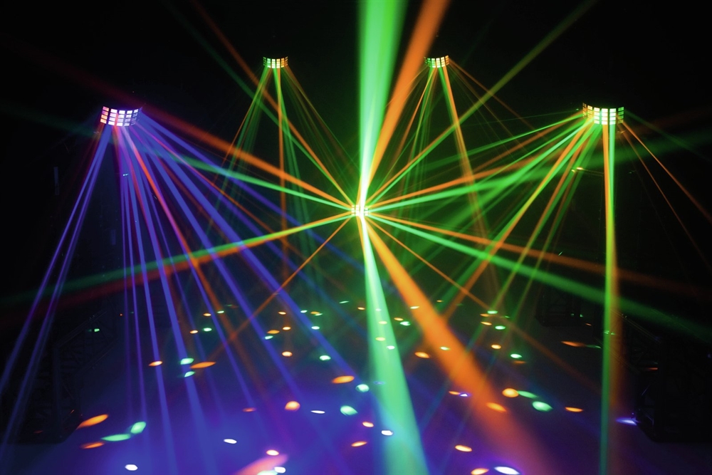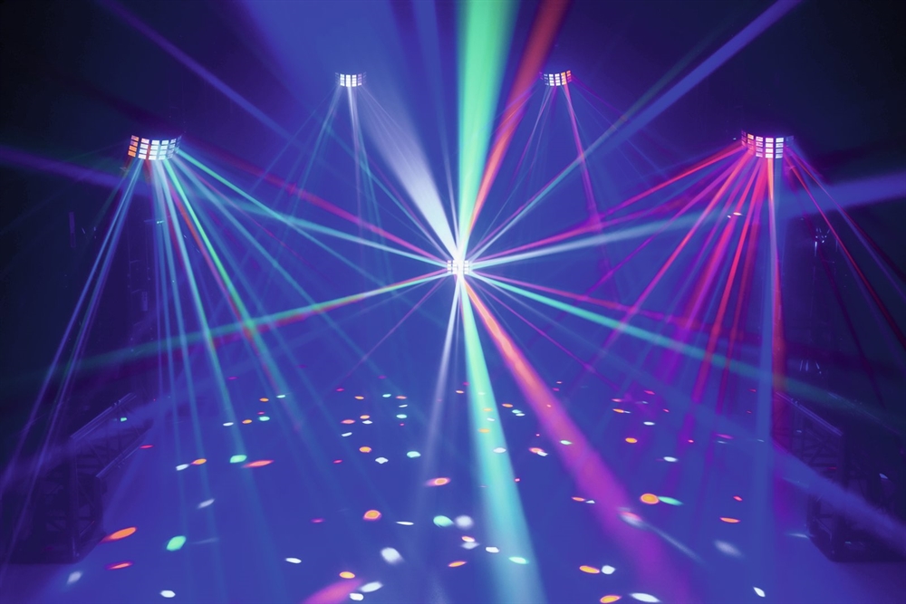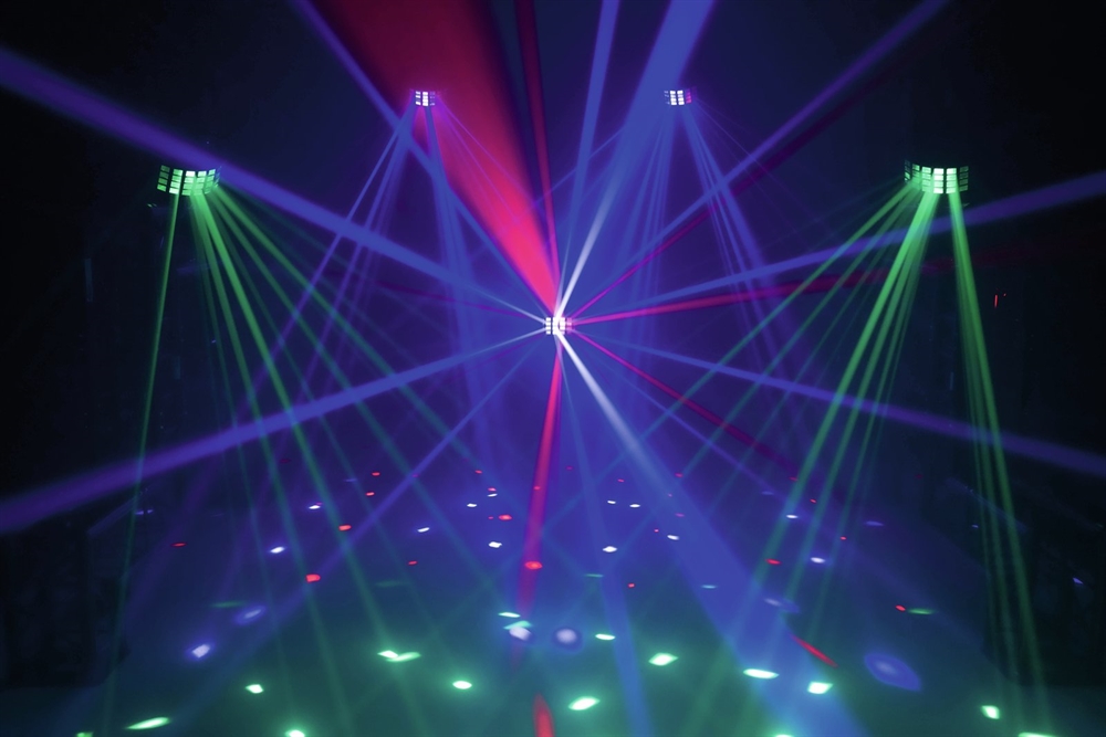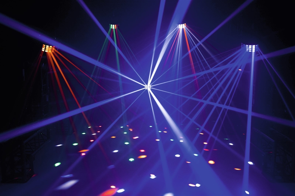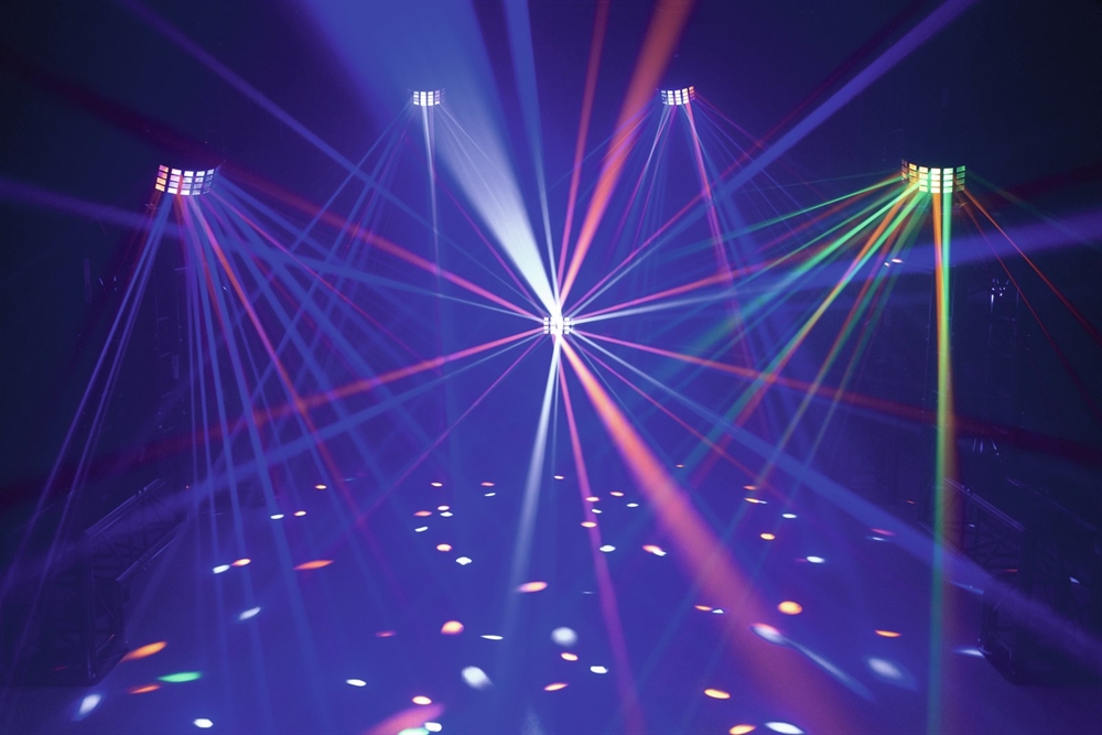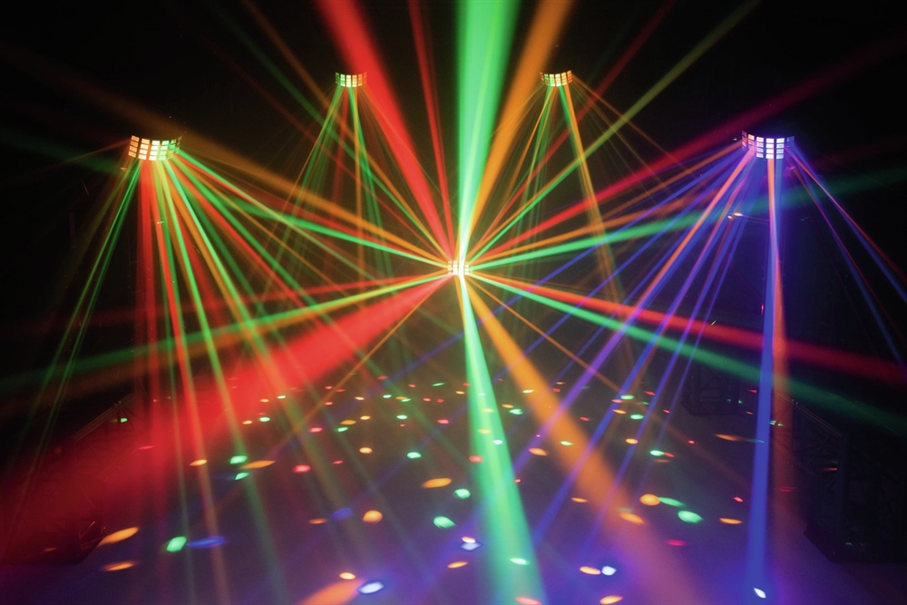 - 5 x 10 W LED i farverne rød, grøn, blå, rav og hvid til dynamiske stroboskop- og derbyeffekter