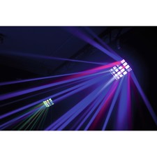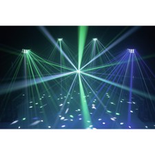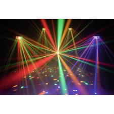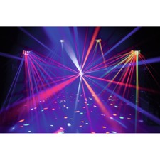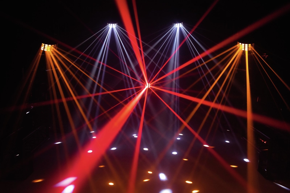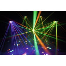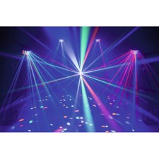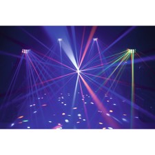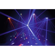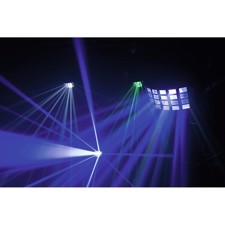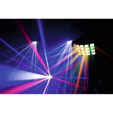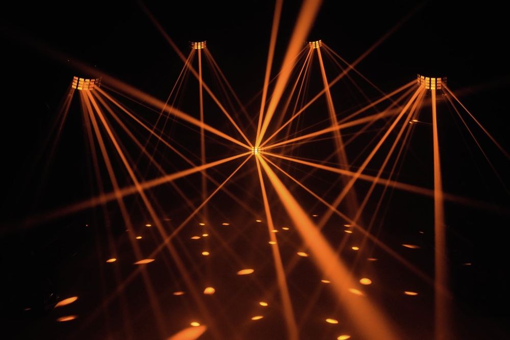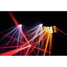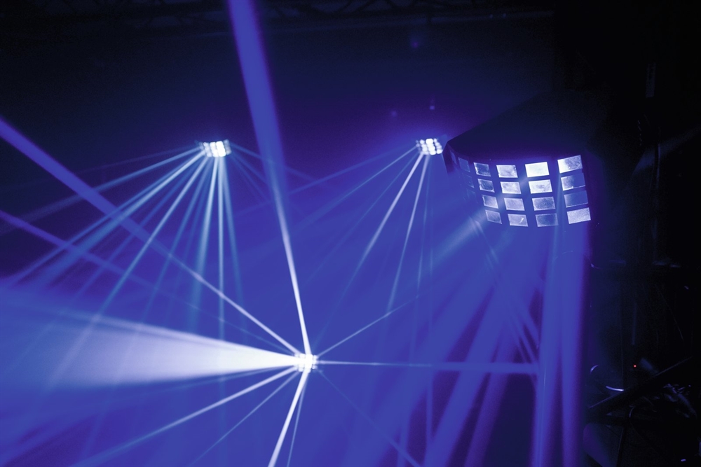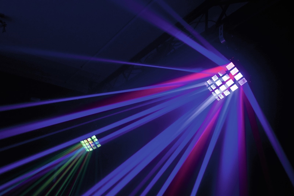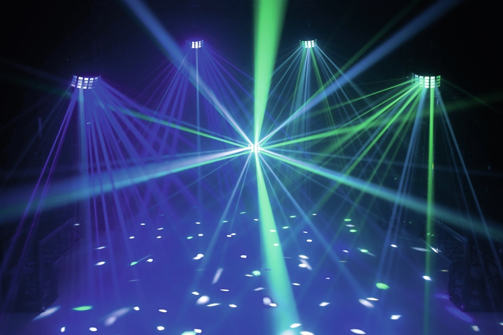 - 5 x 10 W LED i farverne rød, grøn, blå, rav og hvid til dynamiske stroboskop- og derbyeffekter