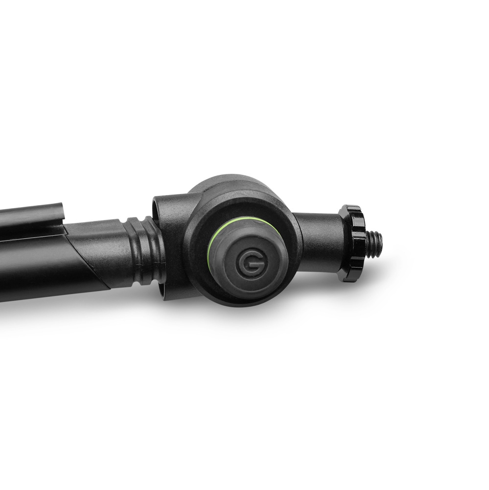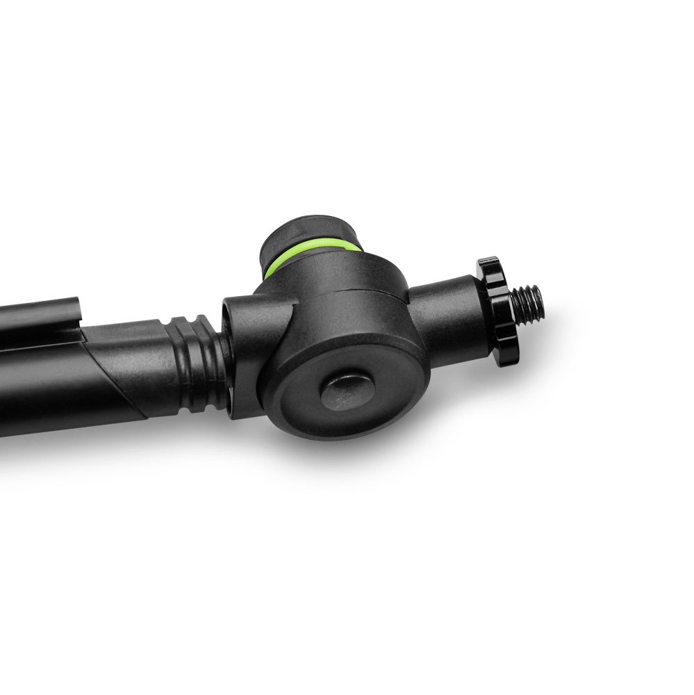 With its three joints the desk-mounted microphone boom arm can be placed in pretty much any position you want. Another special feature that Gravity® developed for the microphone holder mechanism allows you to pull out the entire microphone holder with one hand and rotate it in 90° increments, even after the microphone has been screwed in place with the microphone or shock mount. The holder then automatically snaps back into place. Why is that so special?
