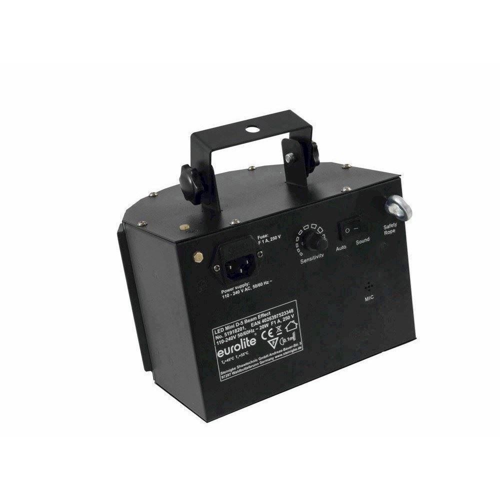 LED Mini D-5 Beam Effect af EUROLITE vil give dig evnen til at forvandle ethvert rum til en lille diskotek. Lys-effekterne ændrer sig altid i takt med musikken og oplyser hele rummet med pulserende stråler, der skaber et varieret farvespil.