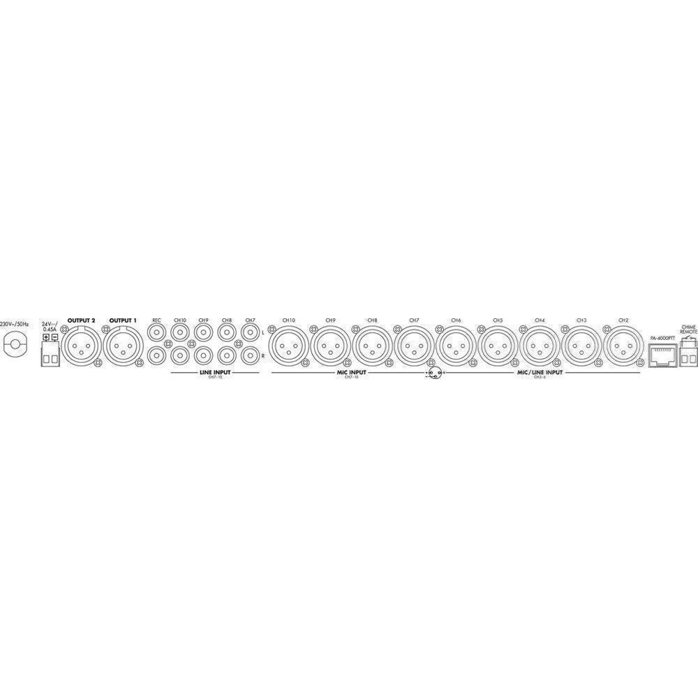 | Connections | 9 x XLR (mic/line inputs), 4 x RCA L/R (line inputs), 1 x RJ45 (push-to-talk microphone), 2 x XLR (outputs), 1 x RCA L/R (record output) |