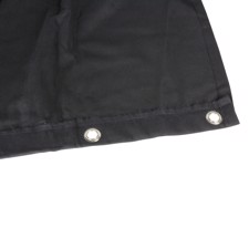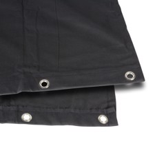 Non-see-thru, black blackout cloth impregnated with fire retardant (B1 according to DIN 4102) and 300-g-quality, as curtain, backdrop or for decorative purposes. The fabrics have grommets at intervals of 25 centimetres along one side and are backed with an additional strip of webbing, permitting fast and secure installation both tightly stretched as well as loosely pleated. The grommets have a rustproof, burnished and a 15-millimetre hole diameter. The outer edges are hemmed, while the bottom edge is unhemmed, so that the material can be cut to the necessary length quickly and easily. The eyelets are on the wide side.