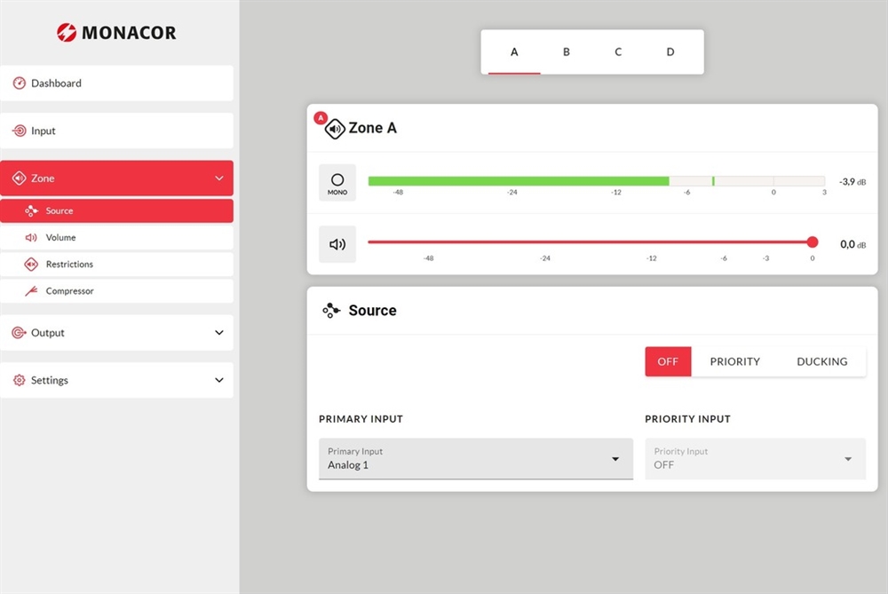 4 zone outputs (4/8 Ω) or 2 zone outputs (100 V) via plug-in screw terminal