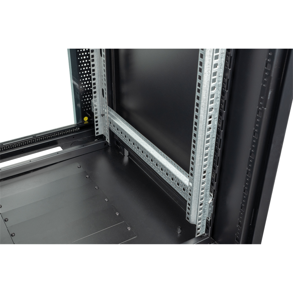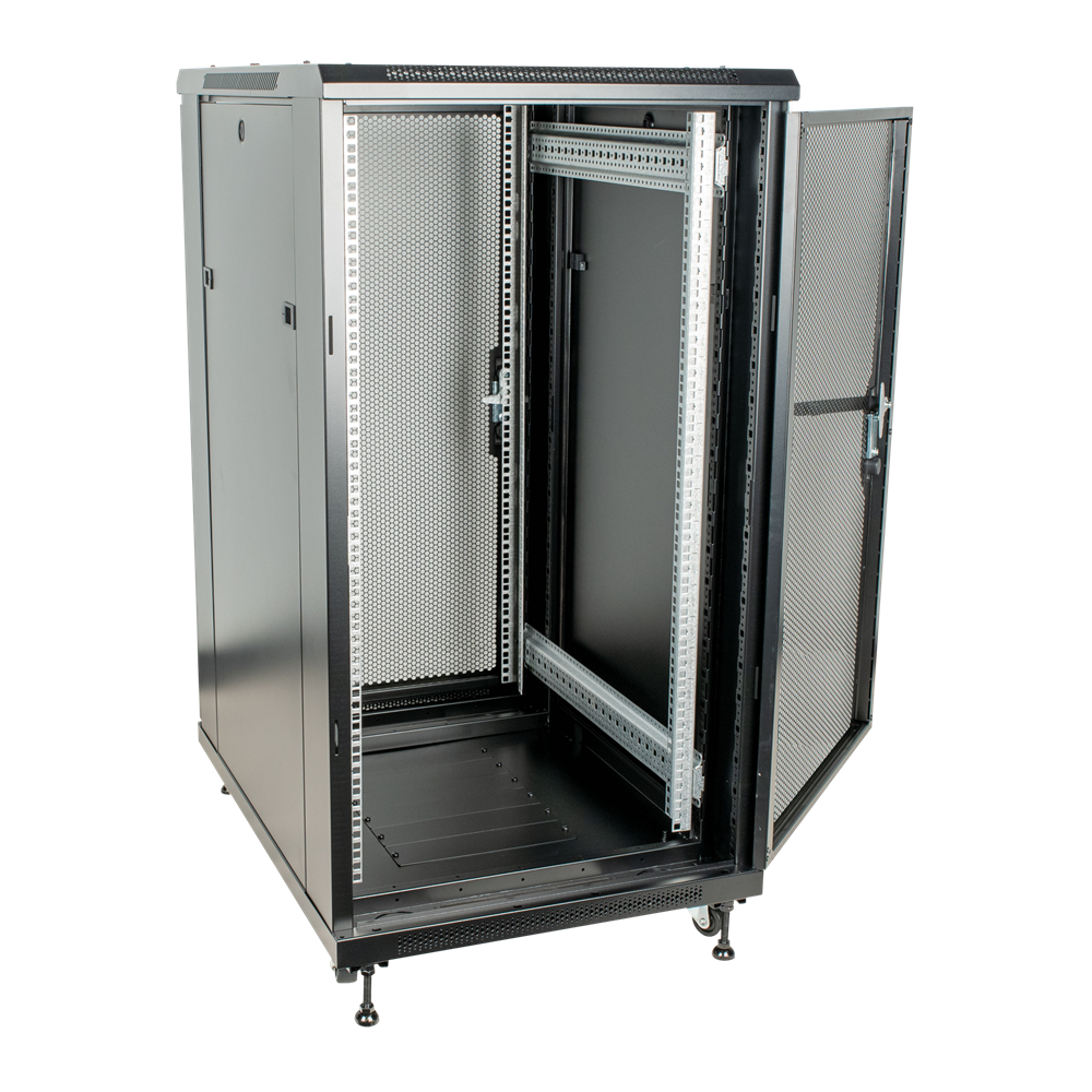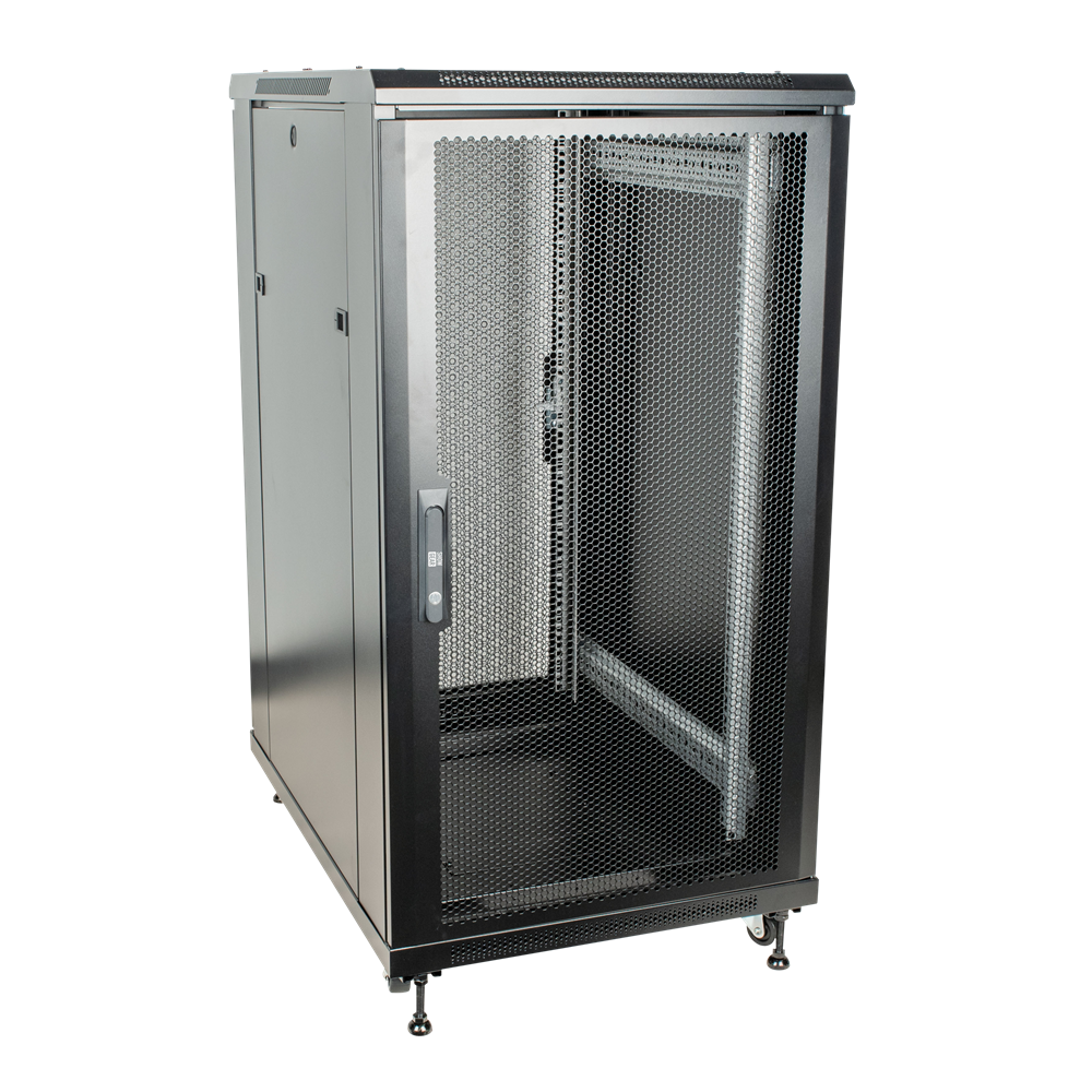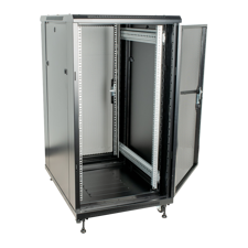 Netværksskab med glasdør RCA-FSM-22 er et låsbart 19" netværksskab med en 22 rack enheds højde (978 mm). Den kommer med både drejelige hjul og gummifødder. Du kan vælge mellem begge muligheder, hvilket gør det velegnet til både mobile og faste applikationer. Dette netværksskab kan åbnes fra enhver side, da det har to aftagelige sidepaneler og en gitterdør på bagsiden og forsiden af enheden. Dette gør det nemt at installere og opdatere 19-tommers rackware.