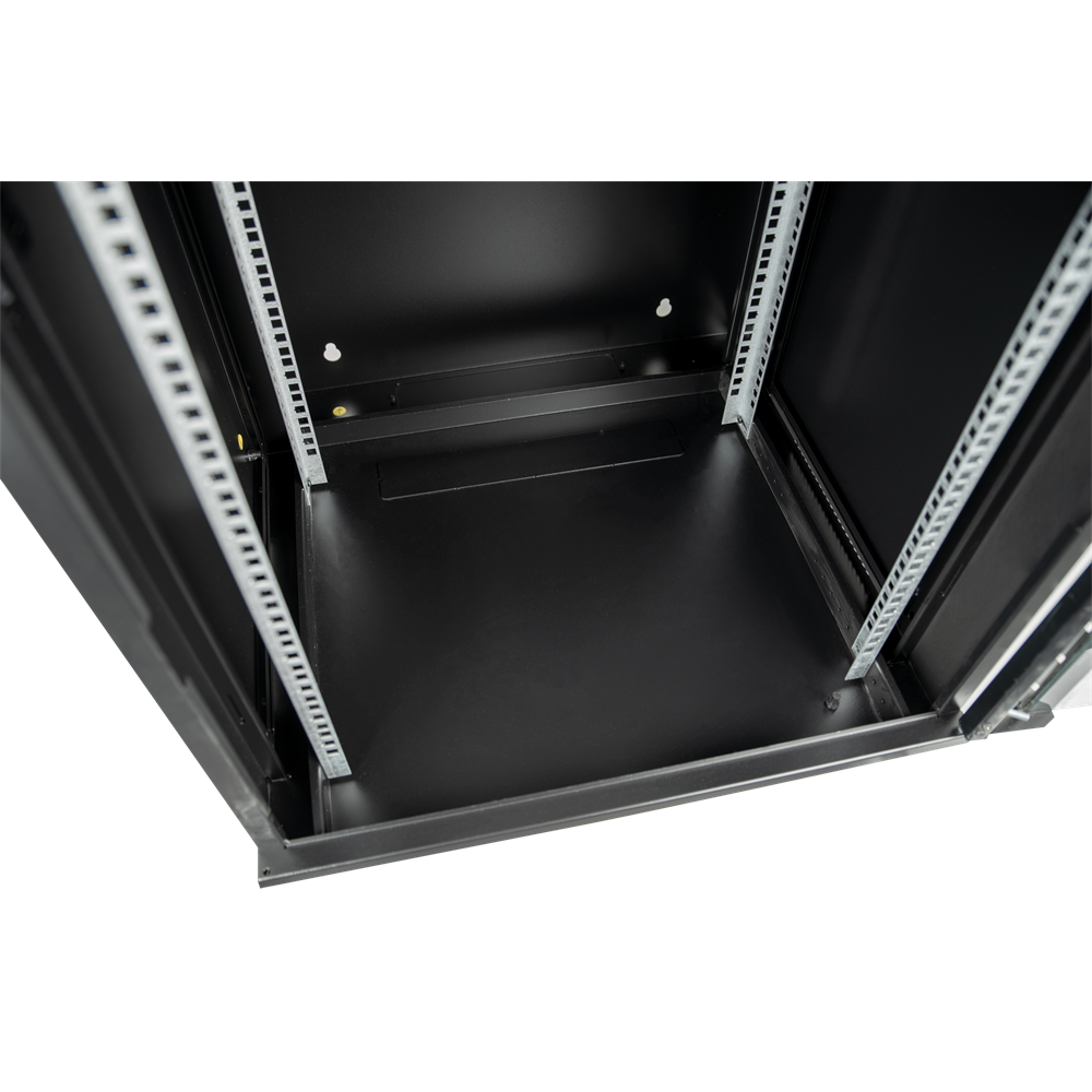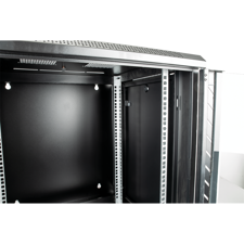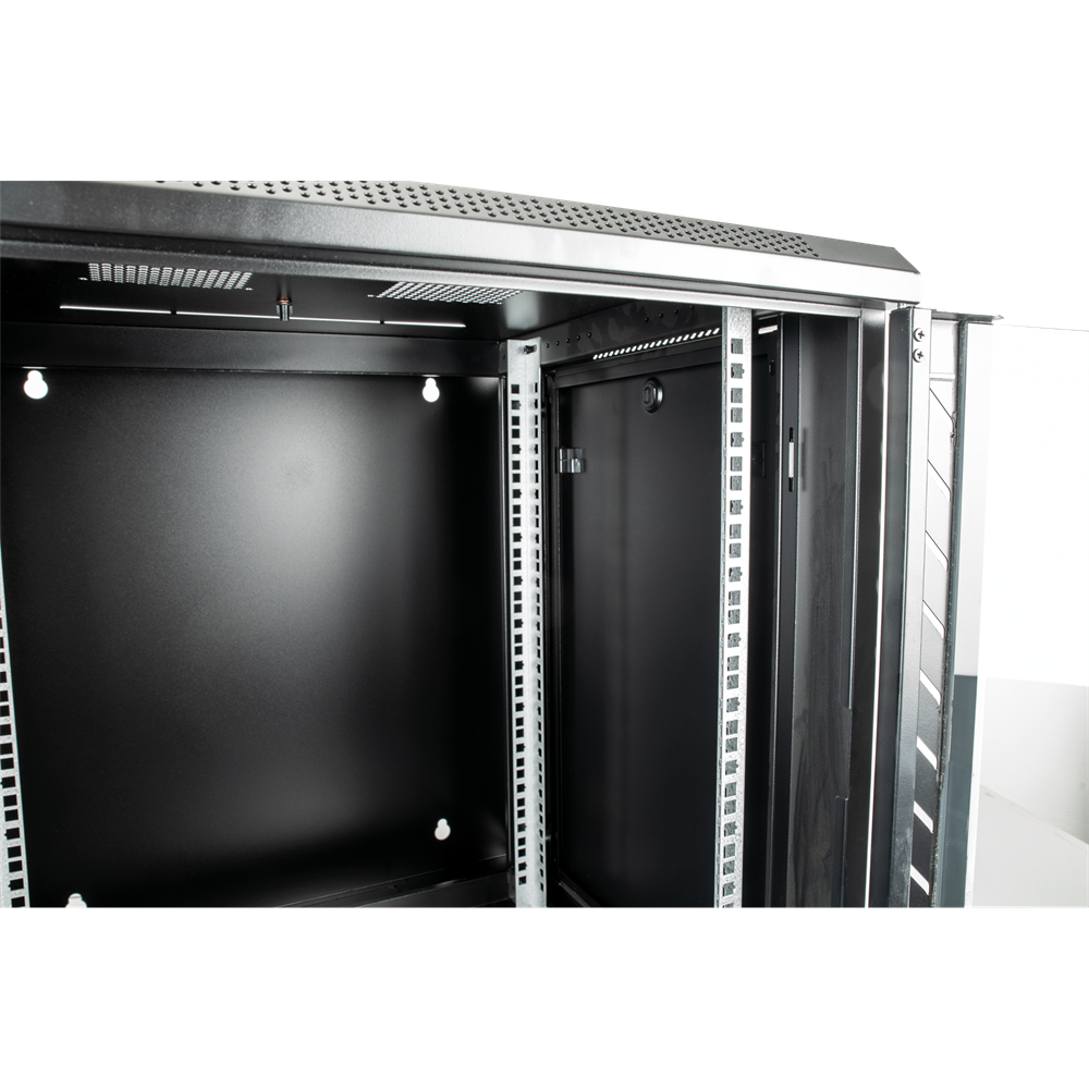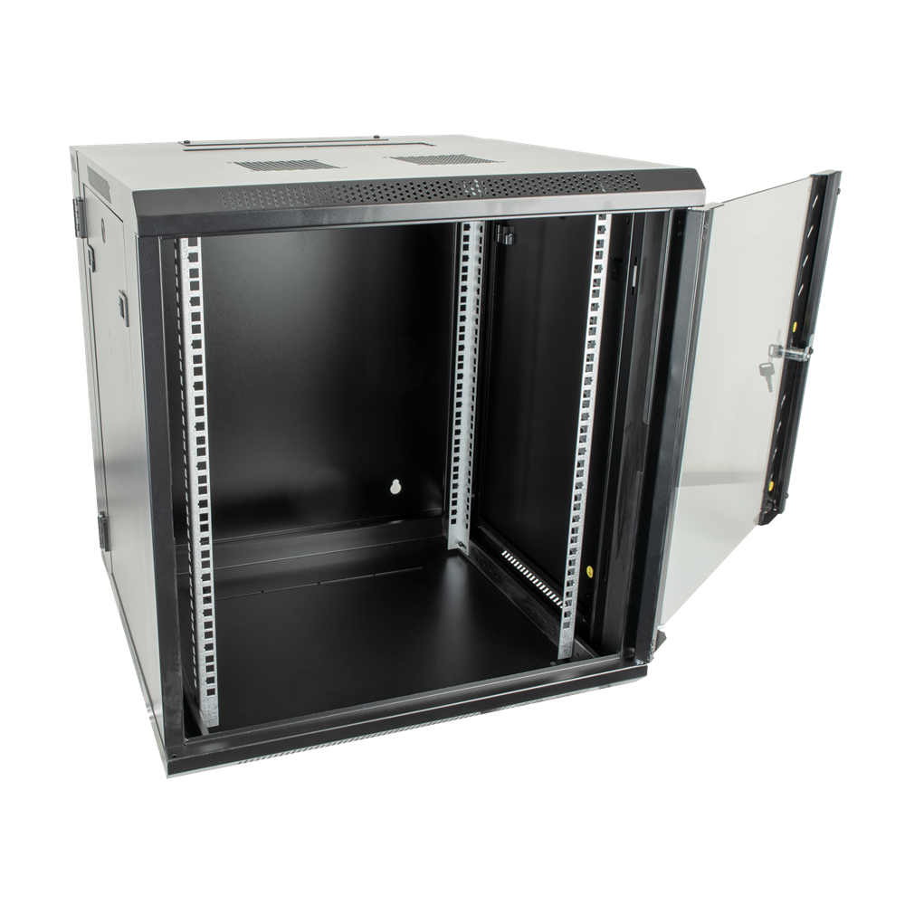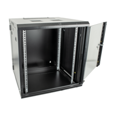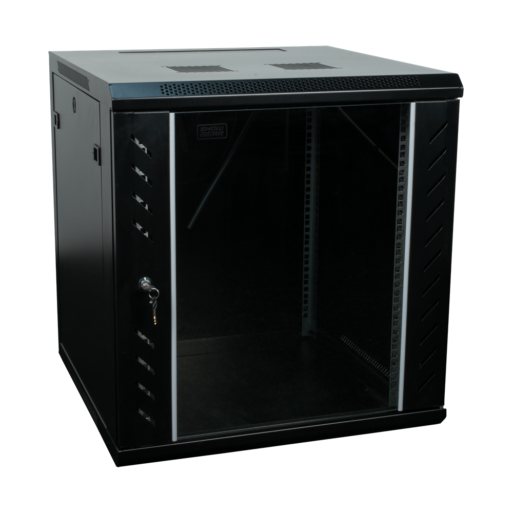 Netværksskab med glasdør RCA-WMH-12 er et aflåseligt 19" vægmonteret rack med en patch panel dybde på 400 mm (15,8") og en højde på 12 rackenheder, ideel til faste indendørs installationer. Udstyret med en hængsel ved bagpanelet og aftagelige sidepaneler, gør det dig i stand til nemt at arbejde ved tilslutningspanelerne fra siden eller bag på enheden. RCA-WMH-12 har en elegant og stærk dør af stål med en hærdet glasfront, der er lavet til at holde og yde. Den leveres med et 19" installationskit, bolt og skive, møtrik, sekskantnøgle, nøgler og skruer.