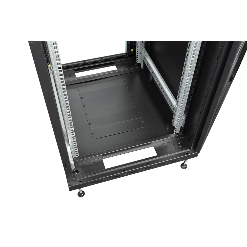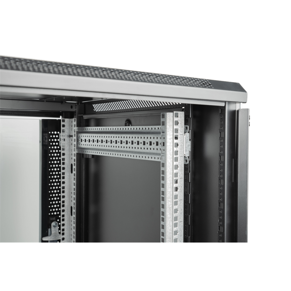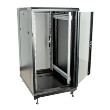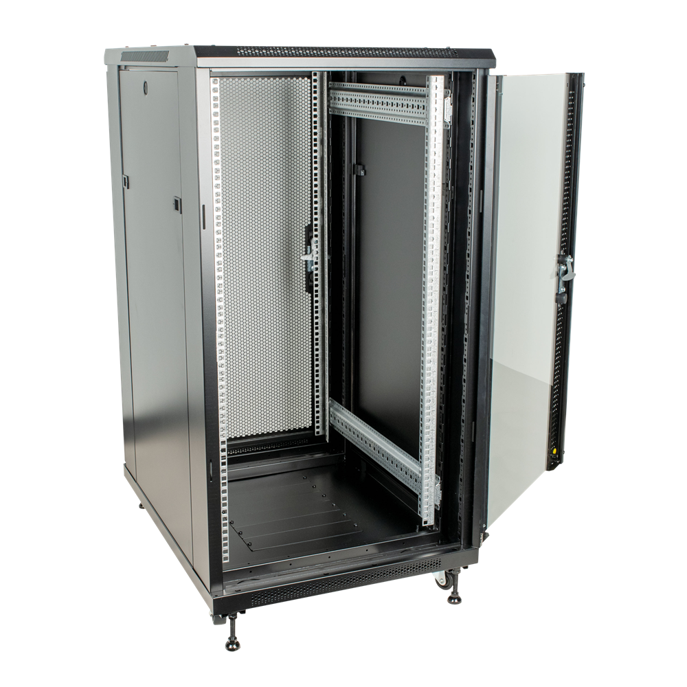 Netværksskab med glasdør RCA-FSG-22 er et låsbart 19" netværksskab med en højde på 22 rackenheder (978 mm). Det kommer med både drejehjul og gummi fødder. Du kan vælge mellem begge muligheder, hvilket gør det velegnet til både mobile og faste applikationer. Dette netværksskab kan åbnes fra alle sider, da det har to aftagelige sidepaneler, en gitterdør bagpå og en glasdør foran på enheden. Dette gør det nemt at installere og opdatere 19-tommer rackudstyr.