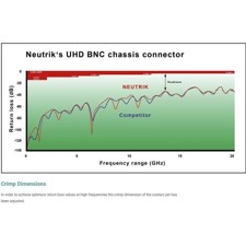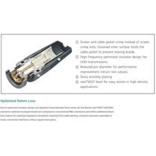 Optimized contact pin and insulator design for UHD-data transmissionsProven rearTWIST technologySwiss antraloy platingFully compatible with conventional BNC chassis connectorsImproved return loss values at high frequencies