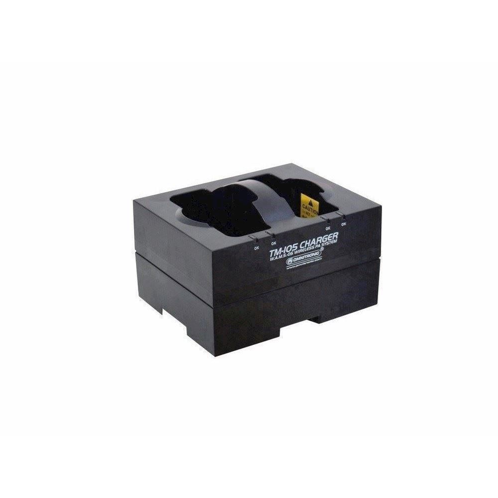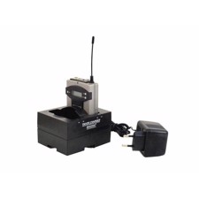 The charging station serves for quick and easy charging of the rechargeable batteries of the pocket transmitter TM-105, which is a component of the PA system W.A.M.S.-05. The charging station allows to charge up to two units simultaneously. For charging, the batteries remain in the pocket transmitter; the unit is simply inserted into the charging compartment.