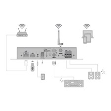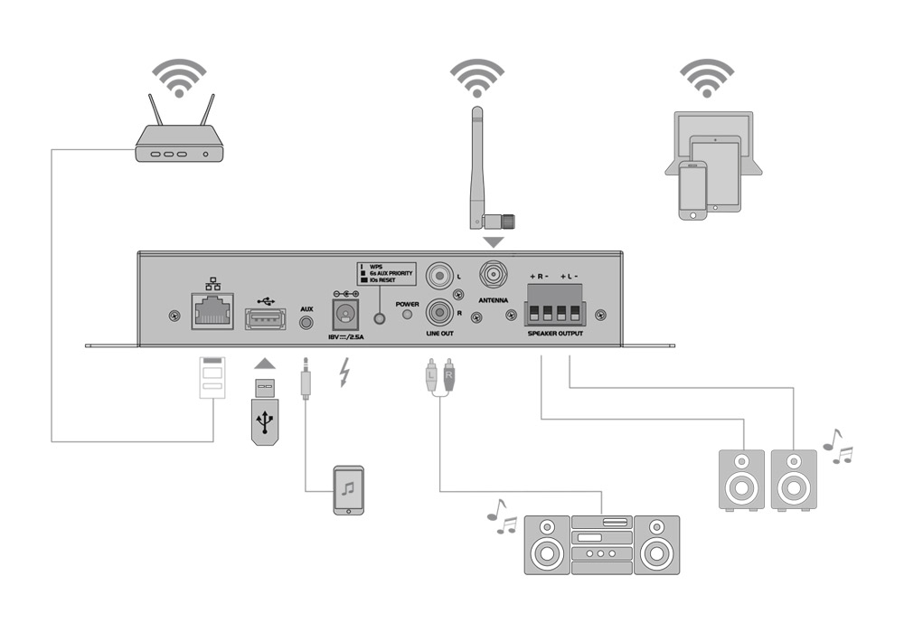 - Receives audio signals via WiFi and transmits these to existing speakers