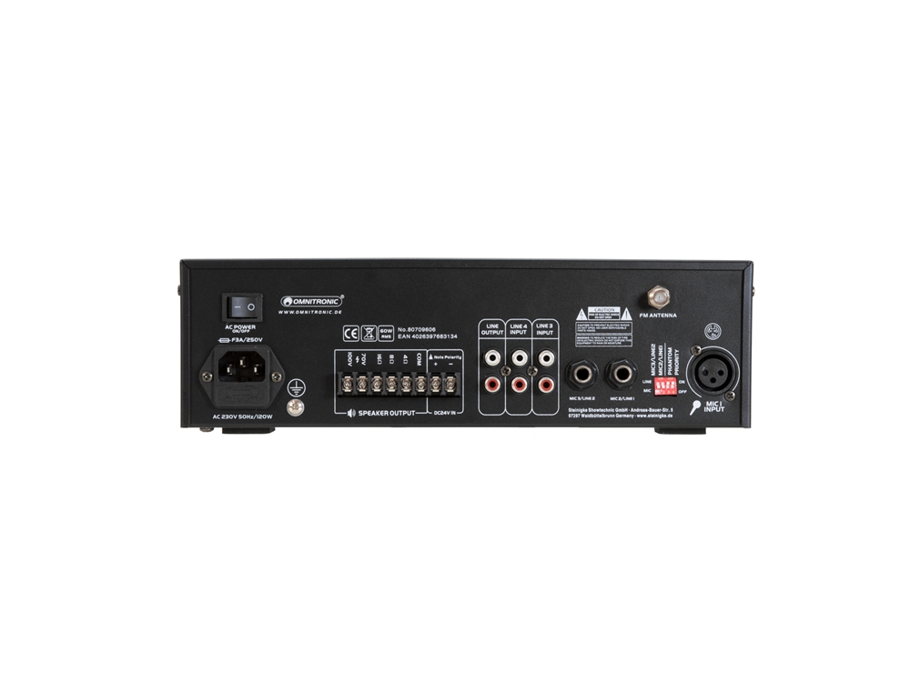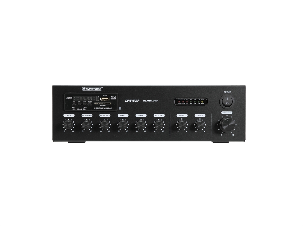 Her er du: Disconetto » brand » Omnitronic OMNITRONIC CPE-60P PA Mixing Amplifier På lager På lager, 3-5 hverdage Bedømmelse for OMNITRONIC CPE-60P PA Mixing AmplifierProduktet er endnu ikke bedømt Før 1.729,001.499,00DKK ved 1 stk. Vis uden moms Trustpilot PA mono mixing amplifier, MP3 player & IR remote, Bluetooth, 60 watts OMNITRONIC CPE-60P PA Mixing Amplifier PA mono mixing amplifier, MP3 player & IR remote, Bluetooth, 60 wattsPA outputs for 70 V or 100 V PA speakersPA outputs for low-impedance speakers (4-16 ohms)Built-in audio player with Bluetooth receiver and IR remote controlStream music wirelessly from your mobile devices (e.g. smartphone, tablet) via BluetoothSD card slot and USB inputFM tuner with auto scan3 microphone inputs with separate level controlsMic 1 with phantom power and priority circuit Mic 2 and 3 switchable mic/line2 line inputs with separate level controls 1 line outputTreble and bass and master controls for the output signal4-fold LED level displayProtection circuits with LED indication: overload, short circuit, clip limiter, overheatMains operation and 24 V emergency power operationCompact desktop consoleControlling by Bluetooth; IR remote control included2 U Power supply:230 V AC, 50 HzOr24 VPower consumption:120 WOutput power:60 W RMSBattery:1 x button cell CR2025 Button cell 3.0 V CR2025 lithium manganese built-inPower connection:Mains input IEC connector (M) mounting version Power supply cord with safety plug includedBattery/battery pack (not included)Impedance:1 x 4 Ohm; 1 x 8 Ohm; 1 x 16 Ohm; 1 x 100 V ELAControl:Bluetooth; IR remote control includedAudio player:USB + SD + Bluetooth + FM RadioEqualizer:Master: 1 x 2-band tone controlCircuitry:Class DConnections:Input: 1 x Microphone via 3-pin XLRInput: 2 x mic/line via 6.3 mm jack socket (stereo) mounting versionInput: 2 x line via stereo RCAOutput: 1 x line via stereo RCA 0.774 VOutput: speakers via screw terminalFormat:MP3Housing design:2 UDimension:Width: 30.3 cmDepth: 22 cmHeight: 9.1 cmWeight:3.50 kg Varenr.: E-80709606 Vi anbefaler IEC LOCK IEC Power Cable locking 3x1.0 1m bk DKK 79,00