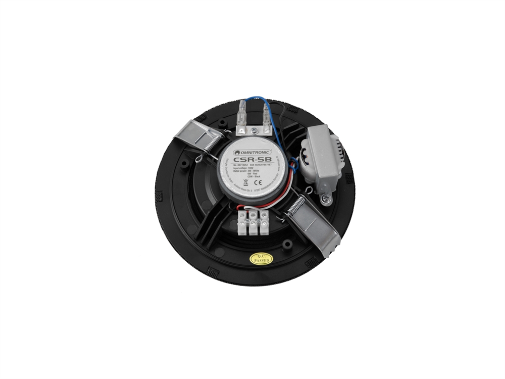 Her er du: Disconetto » brand » Omnitronic OMNITRONIC CSR-5B Ceiling Speaker black På lager På lager, 3-5 hverdage Bedømmelse for OMNITRONIC CSR-5B Ceiling Speaker blackProduktet er endnu ikke bedømt 219,00DKK ved 1 stk. Vis uden moms Trustpilot 5" flush-mount speaker, 100 V, 6 W RMS, � 145 mm OMNITRONIC CSR-5B Ceiling Speaker black 5" flush-mount speaker, 100 V, 6 W RMS, Ø 145 mm13 cm full-range speaker (5")100 V transformer with 2 power tapsEasy mounting, similar to standard flush-mount lightsHigh-impact polystyrene (HIPS) enclosure with metal grille in blackFor speech and background music in indoor PA systems Rated power:6 W RMSProgram power:12 WFrequency range:105 - 10000 HzSensitivity:92 dBMax. SPL:103 dBImpedance:100 V ELAPower tapping:3W; 6W RMS via screw terminal switchableSpeakers:1 x woofer (5") approx. 13 cmType of speaker:Flush-mount speakerMaterial:PlasticColor:BlackAdditional dimensions:Mounting dimensions: Ø 14.5 cmDimension:Depth: 5.5 cmDiameter: Ø 16.2 cmWeight:0.50 kg Varenr.: E-80710252