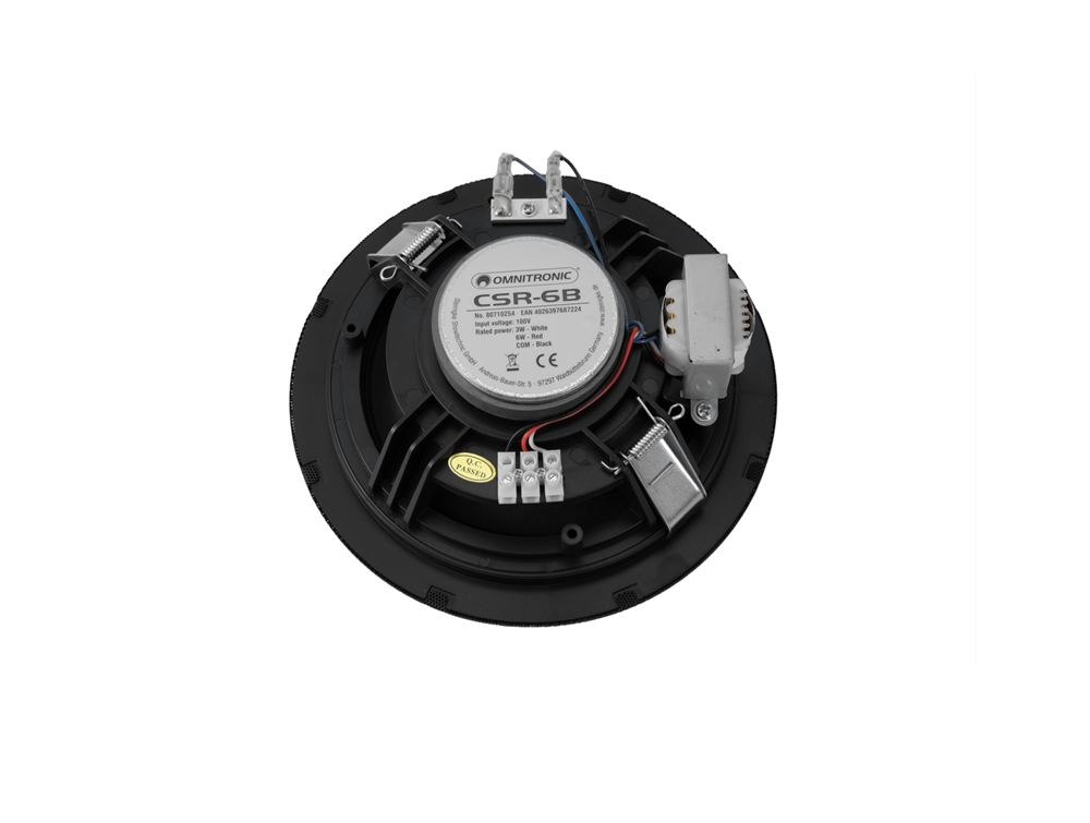 Her er du: Disconetto » brand » Omnitronic OMNITRONIC CSR-6B Ceiling Speaker black På lager På lager, 3-5 hverdage Bedømmelse for OMNITRONIC CSR-6B Ceiling Speaker blackProduktet er endnu ikke bedømt 269,00DKK ved 1 stk. Vis uden moms Trustpilot 6" flush-mount speaker, 100 V, 6 W RMS, � 170 mm OMNITRONIC CSR-6B Ceiling Speaker black 6" flush-mount speaker, 100 V, 6 W RMS, Ø 170 mm16.5 cm full-range speaker (6.5")100 V transformer with 2 power tapsEasy mounting, similar to standard flush-mount lightsHigh-impact polystyrene (HIPS) enclosure with metal grille in whiteFor speech and background music in indoor PA systems Rated power:6 W RMSProgram power:12 WFrequency range:75 - 20000 HzSensitivity:93 dBMax. SPL:104 dBImpedance:100 V ELAPower tapping:3W; 6W RMS via screw terminal switchableSpeakers:1 x woofer (6") approx. 15 cmType of speaker:Flush-mount speakerMaterial:PlasticColor:BlackAdditional dimensions:Mounting dimensions: Ø 17 cmDimension:Depth: 7.8 cmDiameter: Ø 19.3 cmWeight:0.76 kg Varenr.: E-80710254