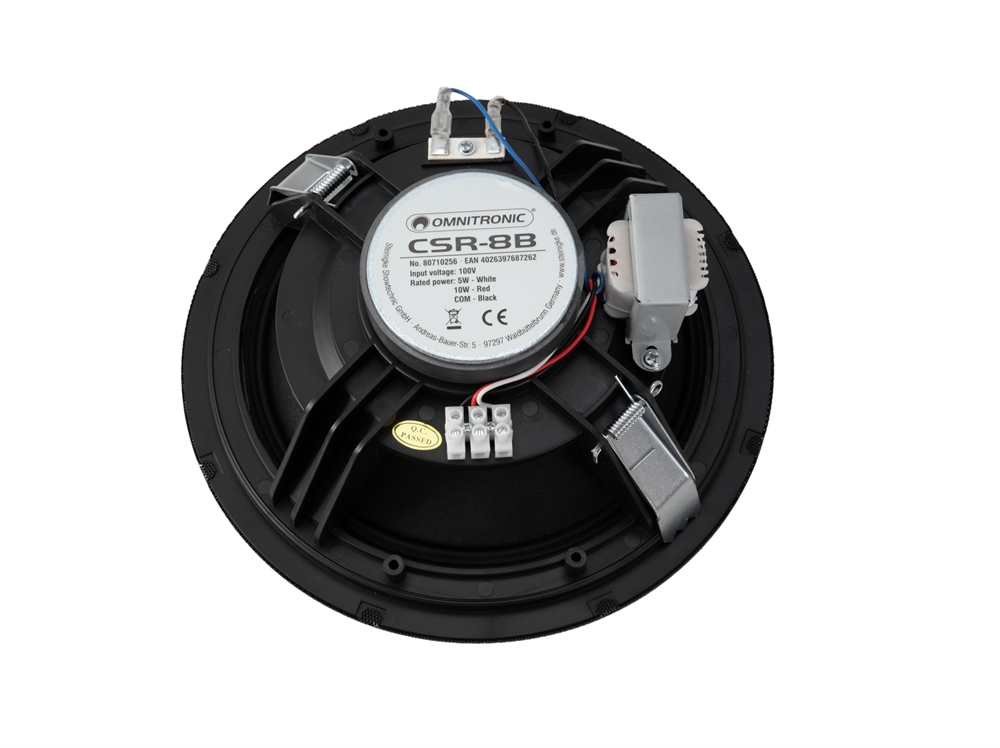 Her er du: Disconetto » brand » Omnitronic OMNITRONIC CSR-8B Ceiling Speaker black På lager På lager, 3-5 hverdage Bedømmelse for OMNITRONIC CSR-8B Ceiling Speaker blackProduktet er endnu ikke bedømt 279,00DKK ved 1 stk. Vis uden moms Trustpilot 8" flush-mount speaker, 100 V, 10 W RMS, � 215 mm OMNITRONIC CSR-8B Ceiling Speaker black 8" flush-mount speaker, 100 V, 10 W RMS, Ø 215 mm20 cm full-range speaker (8") 100 V transformer with 2 power tapsEasy mounting, similar to standard flush-mount lightsHigh-impact polystyrene (HIPS) enclosure with metal grille in blackFor speech and background music in indoor PA systems Rated power:10 W RMSProgram power:20 WFrequency range:50 - 20000 HzSensitivity:94 dBMax. SPL:107 dBImpedance:100 V ELAPower tapping:5W; 10W RMS via screw terminal switchableSpeakers:1 x woofer (8") approx 20 cmType of speaker:Flush-mount speakerMaterial:PlasticColor:BlackAdditional dimensions:Mounting dimensions: Ø 21.5 cmDimension:Depth: 8.6 cmDiameter: Ø 23.2 cmWeight:0.95 kg Varenr.: E-80710256