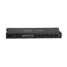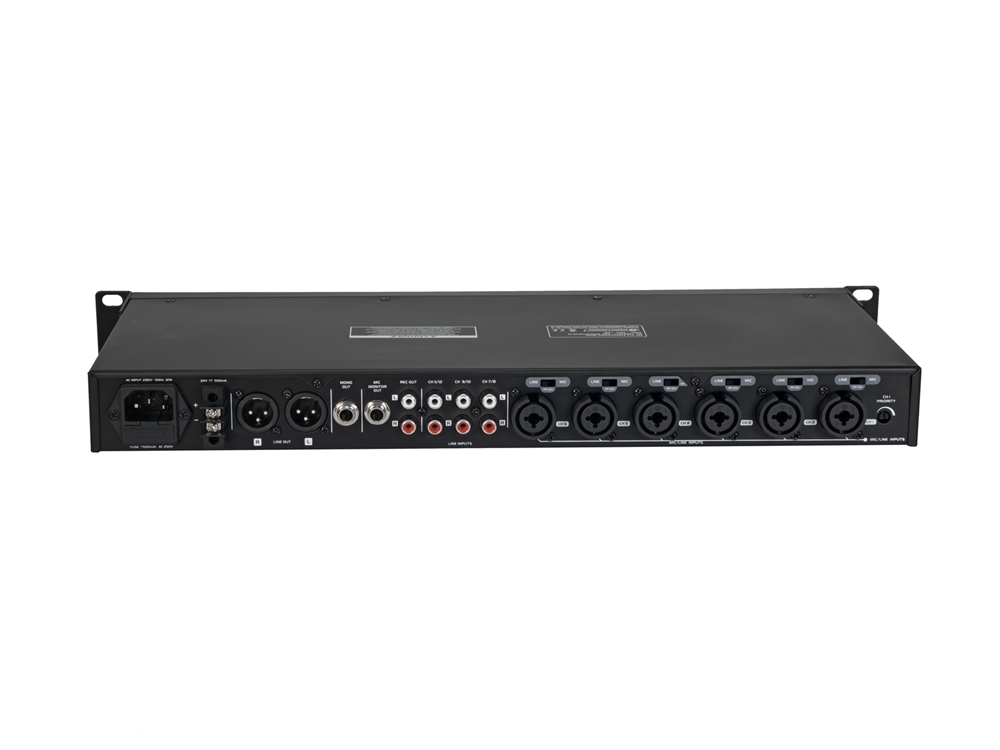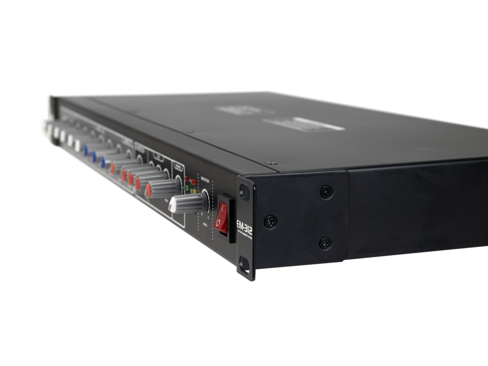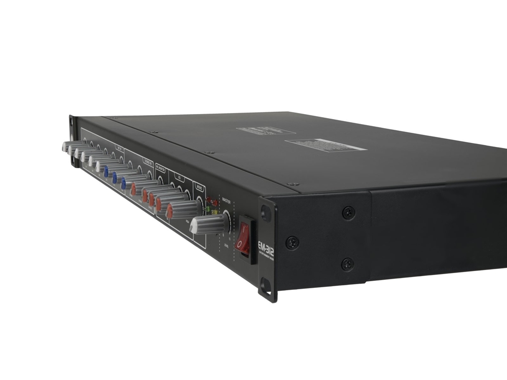 The EM-312 is a slim rack-mounted 12-channel mixer with 6 mic/line combo inputs and 6 additional line inputs. It has XLR outputs, a 6.3 mm mono output, a stereo RCA recording output, and a 6.3 mm monitoring output for the mic section. The EM-312 offers separate volume controls for all inputs in addition to volume control for the mono output and a master volume control. It has a 3-band equalizer and an adjustable priority function for microphone announcements through channel 1.
