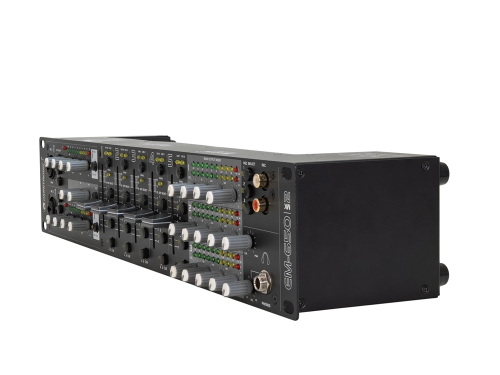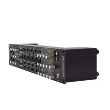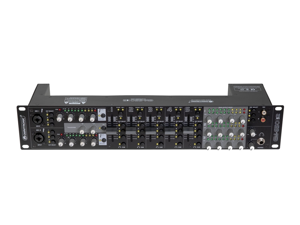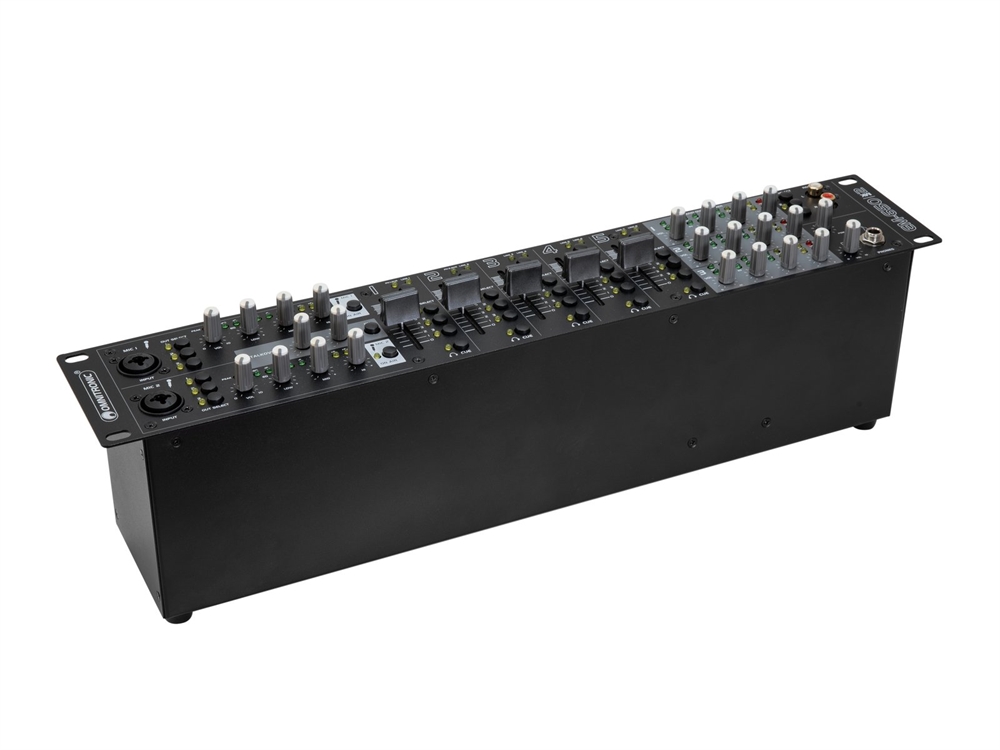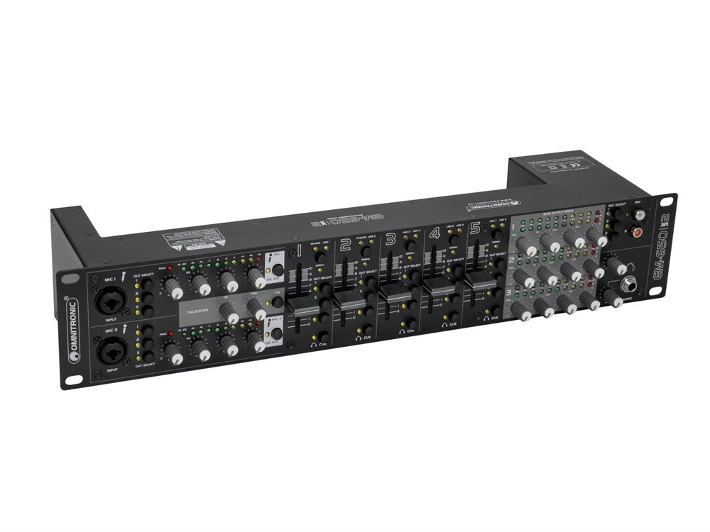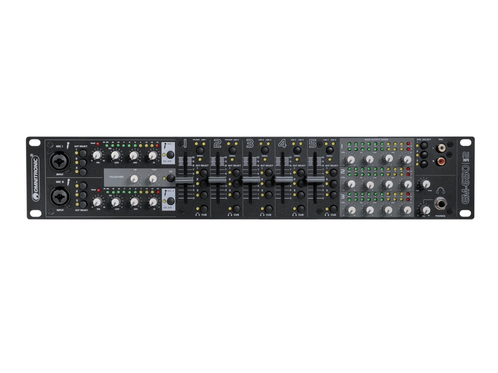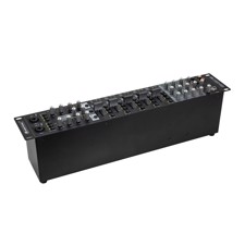| Channels: | Input chanel: 2 x stereo with Line-Line/Phono switch via RCA, channel control via fader, 3-band tone control EQ, Routing master bus switch, gain control, source selector, CUE switch Input chanel: 3 x stereo with Line-line switch via RCA, channel control via fader, Routing master bus switch, gain control, source selector, CUE switch Microphon chanal: 2 x mono via Combination socket (XLR/jack), channel control via Rotary dial, ON AIR switch, Routing master bus switch, Talkover switch, Master output: 3 x stereo via XLR or RCA, channel control via Rotary dial, 3-band tone control EQ Rec. output: 1 x stereo via RCA, Routing master bus switch, Headphones output: 1 x stereo via Jack, channel control via Rotary dial, Cue-mix-function, |