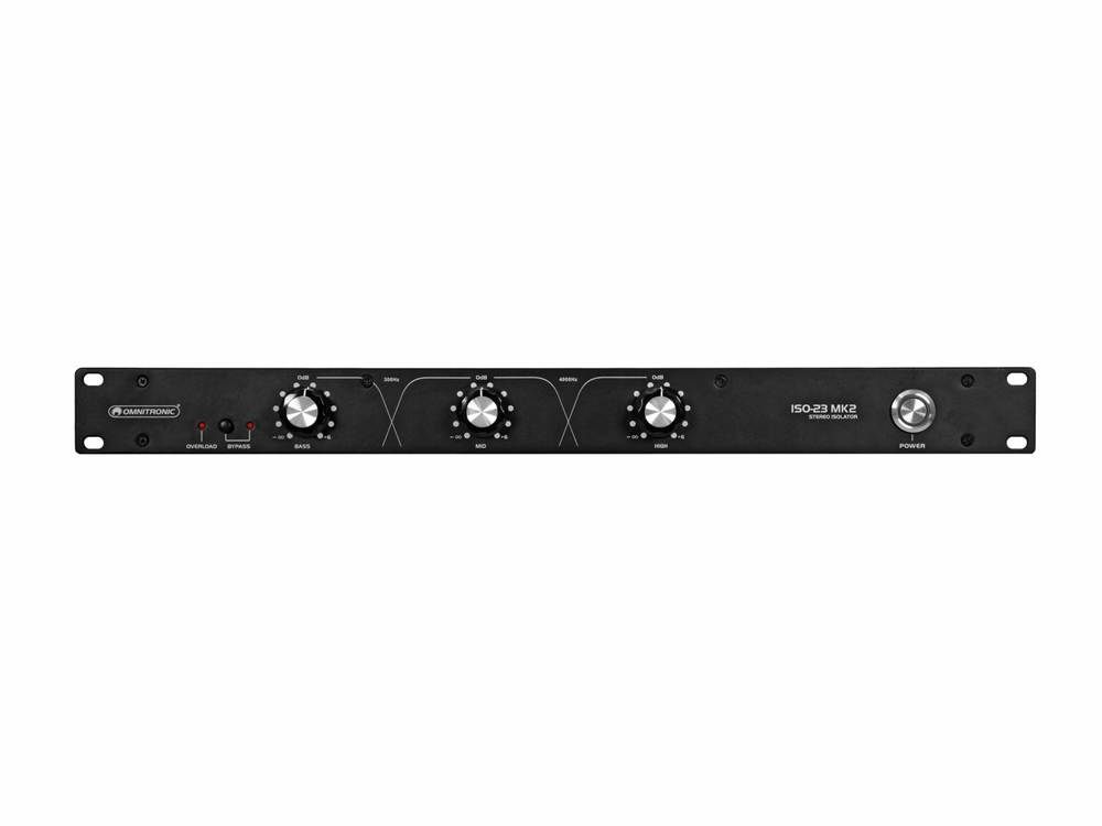 3-band frequency isolator with vintage rotary knobs for DJsWith the Omnitronic ISO-23 MK2 frequency isolator DJs get an effective tool for creative sound shaping in the club or studio. Using high-grade components such as long-life ALPS RK27 potentiometers, the rack-mounted isolator has excellent sound characteristics. The large, smooth rotary knobs enable DJs to radically boost or cut low, mid or high frequencies, making it easy to create instrumental or a cappella versions. The isolator provides XLR and RCA connectors and features a bypass switch for bridging.