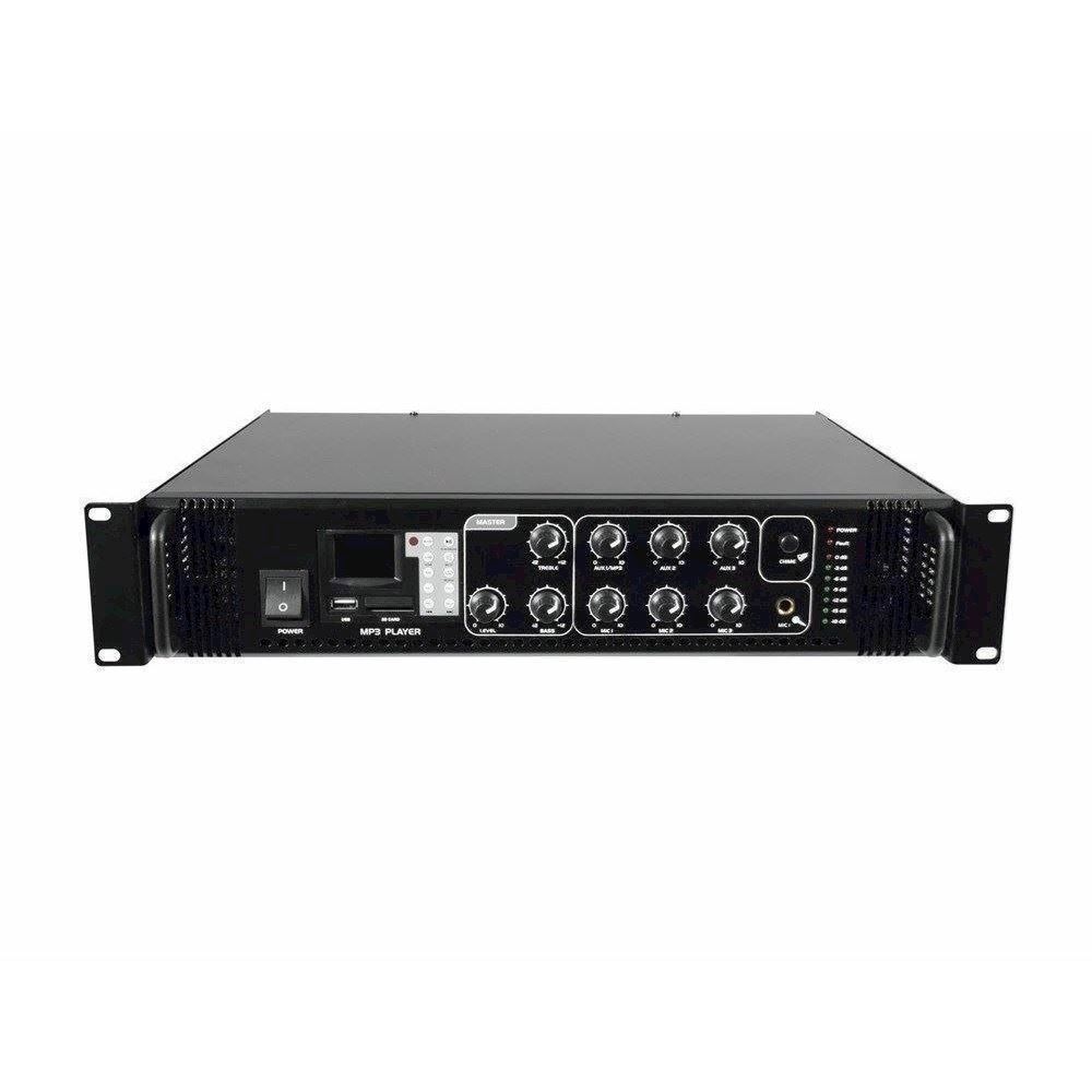 Her er du: Disconetto » brand » Omnitronic OMNITRONIC MP-60P PA mixing amplifier På lager På lager, 3-5 hverdage Bedømmelse for OMNITRONIC MP-60P PA mixing amplifierProduktet er endnu ikke bedømt 2.759,00DKK ved 1 stk. Vis uden moms Trustpilot PA mono mixing amplifier with MP3 player and IR remote control PA mono mixing amplifier with MP3 player and IR remote control, 60 wattsPA outputs for 70 V or 100 V PA speakers or for low-impedance speakers (4-16 ohms)MP3 player with IR remote control and LCD with blue backlightSD card slot and USB inputFolder navigation and repeat functions (1, All)3 microphone inputs (6.3 mm jack, unbal.) with separate level controlsMicrophone input 3 with adjustable priority circuit3 line inputs (stereo RCA) with separate level controls1 line output (stereo RCA)Chime, switchableTreble and bass control for the output signal7-fold LED level displayMaster control for the output signalFan-cooledProtection circuits with LED indication: over current, short circuit, turn-on delayRack installationMaster Equalizer: 1 x 2 band tone control Mono Power supply:230 V AC, 50 HzOutput power:60 W RMSOutput type:70 V, 100 V or 4-16 ohmsMic input:5 mV, 600 ohmsLine input:300 mV, 10 kohmsOutput connectors:Screw connectorsS/N ratio:85 dB (line), 75 dB (mic)Playback format audio player:MP3Available storage media:USB devices and SD(HC) cards up to 32 GBFile system:FAT32Number of files:max. 999Battery remote control:CR 2025Dimensions:483 x 400 x 88 mmPower consumption:120.00 WWeight:8,5 kgAudioplayer:USB + SD Output power:60 W RMSFrequency range:80 - 14000 HzHeight:8,9 cmDepths:4 cmWidth:48,3 cm Varenr.: E-80709611 Vi anbefaler OMNITRONIC L-3 Remote control DKK 18,00 OMNITRONIC LUB-27 Speaker Switch Box DKK 3.579,003.219,00 OMNITRONIC PA 6-zone mono vol contr 20W bk DKK 999,00 19" Metal rack. Åbent. 6 Unit DKK 1.269,00 Rackskuffe i stål. 2 unit. Dybde 36 cm. Med lås DKK 769,00