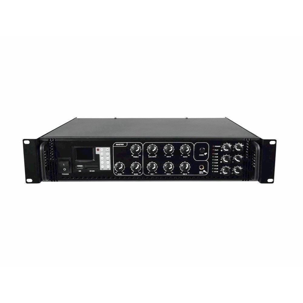 Her er du: Disconetto » brand » Omnitronic OMNITRONIC MPVZ-120.6P PA mixing amp På lager På lager, 3-5 hverdage Bedømmelse for OMNITRONIC MPVZ-120.6P PA mixing ampProduktet er endnu ikke bedømt 4.259,00DKK ved 1 stk. Vis uden moms Trustpilot 6-zone PA mono mixing amplifier with MP3 player and IR remote control 6-zone PA mono mixing amp, MP3 player & IR remote, zones switchabel, 120 wattsComfortable control of PA speakers via 6-zone technology6 PA zone outputs with separate 5-step level controlsMaster PA output (70 V and 100 V)Output for low-impedance speakers (4-16 ohms)MP3 player with IR remote control and LCD with blue backlightSD card slot and USB inputFolder navigation and repeat functions (1, All)2 rear microphone inputs (6.3 mm jack, unbal.)1 front microphone input (combination XLR/6.3 mm jack, unbal.) with adjustable priority circuitAll microphone inputs with separate level controls3 line inputs (stereo RCA) with separate level controls1 line output (stereo RCA)Chime, switchableTreble and bass control for the output signal7-fold LED level displayMaster control for the output signalFan-cooledProtection circuits with LED indication: over current, short circuit, turn-on delayRack installationMaster Equalizer: 1 x 2 band tone control Mono Power supply:230 V AC, 50 HzOutput power:120 W RMSOutput type:70 V, 100 V or 4-16 ohmsOutput current:2.5 A (70 V), 1.8 A (100 V)Mic inputs:5 mV, 600 ohmsLine inputs:300 mV, 10 kohmsSpeaker connectors:Screw connectors, terminal blockDistortion:0.5 % (1 kHz)S/N ratio:85 dB (line), 75 dB (mic)Playback format audio player:MP3Available storage media:USB devices and SD(HC) cards up to 32 GBFile system:FAT32Number of files:max. 999Dimensions:483 x 385 x 92 mmPower consumption:240.00 WWeight:10 kgAudioplayer:USB + SD Output power:120 W RMSFrequency range:80 - 16000 HzHeight:8,9 cmDepths:38,5 cmWidth:48,3 cm Varenr.: E-80709783 Vi anbefaler OMNITRONIC L-3 Remote control DKK 18,00 Omnitronic M-60 Dynamisk mikrofon til sang DKK 309,00 19" Metal rack. Åbent. 6 Unit DKK 1.269,00 Rackskuffe i stål. 2 unit. Dybde 36 cm. Med lås DKK 769,00