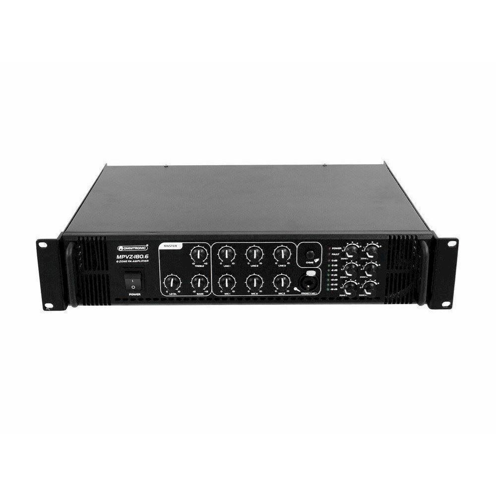 Her er du: Disconetto » brand » Omnitronic OMNITRONIC MPVZ-180.6 PA mixing amplifier På lager På lager, 3-5 hverdage Bedømmelse for OMNITRONIC MPVZ-180.6 PA mixing amplifierProduktet er endnu ikke bedømt 4.609,00DKK ved 1 stk. Vis uden moms Trustpilot 6-zone PA mono mixing amplifier 6-zone PA mono mixing amplifier, 180 watts, adjustable zonesComfortable control of PA speakers via 6-zone technology6 PA zone outputs with separate 5-step level controlsMaster PA output (70 V and 100 V)Output for low-impedance speakers (4-16 ohms)2 rear microphone inputs (6.3 mm jack, unbal.)1 front microphone input (combination XLR/6.3 mm jack, unbal.) with adjustable priority circuitAll microphone inputs with separate level controls3 line inputs (stereo RCA) with separate level controls1 line output (stereo RCA)Chime, switchableTreble and bass control for the output signal7-fold LED level displayMaster control for the output signalFan-cooledProtection circuits with LED indication: over current, short circuit, turn-on delayRack installationMaster Equalizer: 1 x 2 band tone control Mono Power supply:230 V AC, 50 HzOutput power:180 W RMSOutput type:70 V, 100 V or 4-16 ohmsOutput current:2.5 A (70 V), 1.8 A (100 V)Mic inputs:5 mV, 600 ohmsLine inputs:300 mV, 10 kohmsSpeaker connectors:Screw connectors, terminal blockDistortion:0.5 % (1 kHz)S/N ratio:85 dB (line), 75 dB (mic)Dimensions:483 x 385 x 92 mmWeight:12 kgPower consumption:360.00 WOutput power:180 W RMSFrequency range:80 - 16000 HzHeight:8,9 cmDepths:38,5 cmWidth:48,3 cm Varenr.: E-80709781 Vi anbefaler Omnitronic M-60 Dynamisk mikrofon til sang DKK 309,00 OMNITRONIC Speaker cable 2x2.5 100m bk durable DKK 1.689,00 19" Metal rack. Åbent. 6 Unit DKK 1.269,00 Rackskuffe i stål. 2 unit. Dybde 36 cm. Med lås DKK 769,00