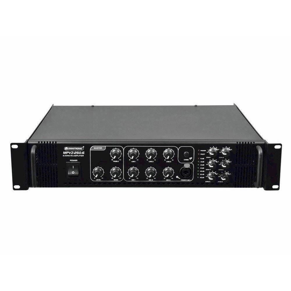Her er du: Disconetto » brand » Omnitronic OMNITRONIC MPVZ-250.6 PA mixing amplifier På lager På lager, 3-5 hverdage Bedømmelse for OMNITRONIC MPVZ-250.6 PA mixing amplifierProduktet er endnu ikke bedømt 5.289,00DKK ved 1 stk. Vis uden moms Trustpilot 6-zone PA mono mixing amplifier 6-zone PA mono mixing amplifier, 250 watts, adjustable zonesComfortable control of PA speakers via 6-zone technology6 PA zone outputs with separate 5-step level controlsMaster PA output (70 V and 100 V)Output for low-impedance speakers (4-16 ohms)2 rear microphone inputs (6.3 mm jack, unbal.)1 front microphone input (combination XLR/6.3 mm jack, unbal.) with adjustable priority circuitAll microphone inputs with separate level controls3 line inputs (stereo RCA) with separate level controls1 line output (stereo RCA)Chime, switchableTreble and bass control for the output signal7-fold LED level displayMaster control for the output signalFan-cooledProtection circuits with LED indication: over current, short circuit, turn-on delayRack installationMaster Equalizer: 1 x 2 band tone control Mono Power supply:230 V AC, 50 HzOutput power:250 W RMSOutput type:70 V, 100 V or 4-16 ohmsOutput current:3.6 A (70 V), 2.5 A (100 V)Mic inputs:5 mV, 600 ohmsLine inputs:300 mV, 10 kohmsSpeaker connectors:Screw connectors, terminal blockDistortion:0.5 % (1 kHz)S/N ratio:85 dB (line), 75 dB (mic)Dimensions:483 x 385 x 92 mmWeight:14 kgPower consumption:500.00 WOutput power:250 W RMSFrequency range:80 - 16000 HzHeight:8,9 cmDepths:38,5 cmWidth:48,3 cm Varenr.: E-80709786 Vi anbefaler Omnitronic M-60 Dynamisk mikrofon til sang DKK 309,00 19" Metal rack. Åbent. 6 Unit DKK 1.269,00 Rackskuffe i stål. 2 unit. Dybde 36 cm. Med lås DKK 769,00